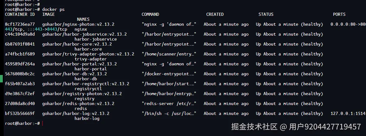 安装完成后,到harbor服务器,等待容器全部启动完成(大概1分钟),通过执行docker ps 查看状态