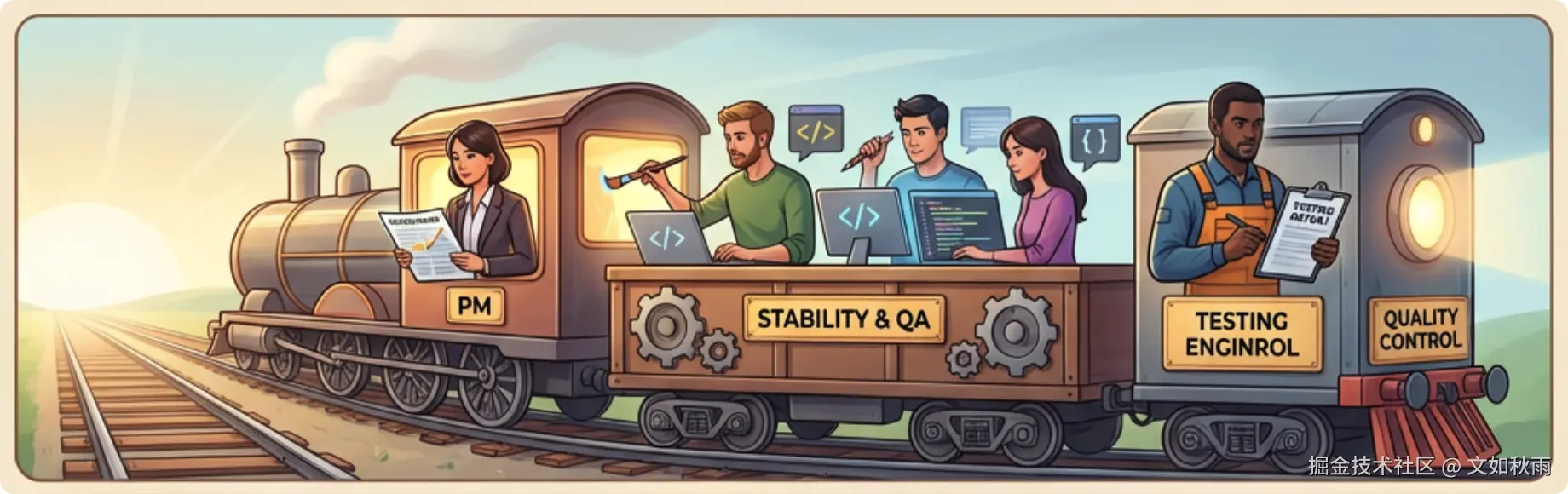产研团队就像是一架火车,前方是明确的目的地,位于火车头的产品经理提前规划好 1~2 个版本的迭代,并拉动着团队火车往前跑。位于中间车厢的开发工程师们负责拆解需求,稳定输出质量并按时交付,稳住中间开发阶段。而在尾节车厢的是测试工程师一方面需要对于交付结果进行检测,另一方面也需要紧抓时间节点、组织迭代复盘从而推着团队往前跑。由此,在敏捷开发的团队协作方式中,由产品、开发、测试所组成的 3 要素火车才能平稳运行。