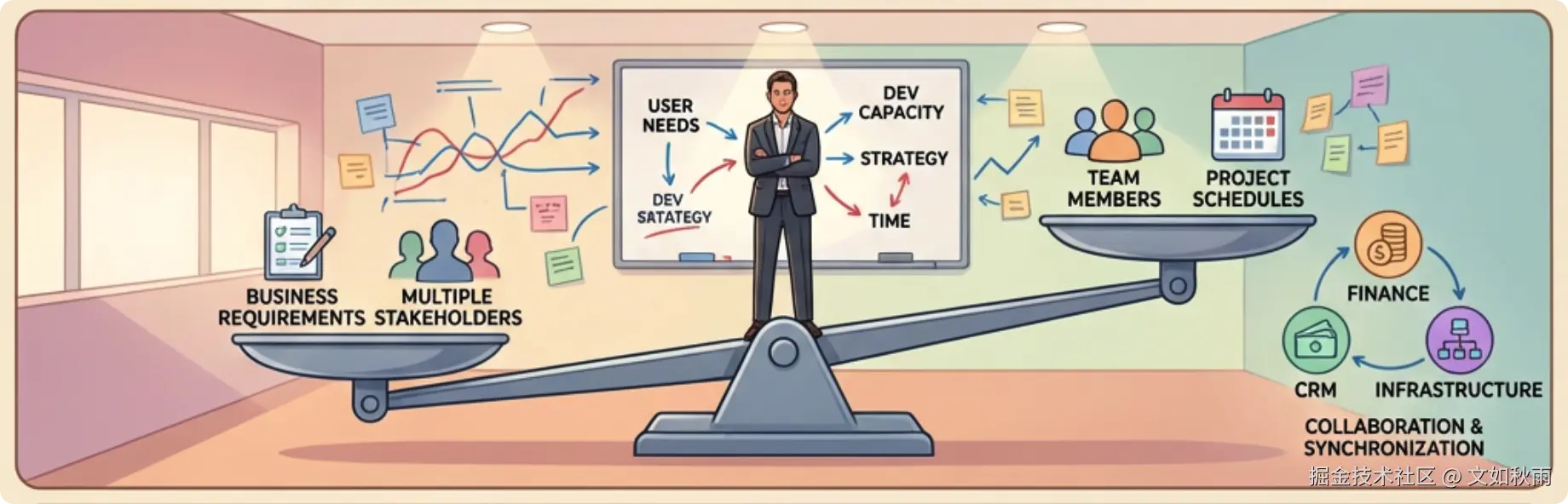如果要说产品经理最重要的软技能是什么,可能标准回答有抽象能力、同理心、Owner思维等等,但现在我的回答是Balance(平衡)。在多角色协同的工作中,除了本身产研内部的产品需求与开发排期之间的 Gap 外,还有对于业务部门为开展业务而产生的诉求与产研开发交付的版本之间的 Gap、不同业务部门之间的理解和信息同步的Gap、自身所在的产研团队与其他开发团队之间的Gap.....一系列的 Gap,都需要中间的衔接者,或者项目的发起者去推动。