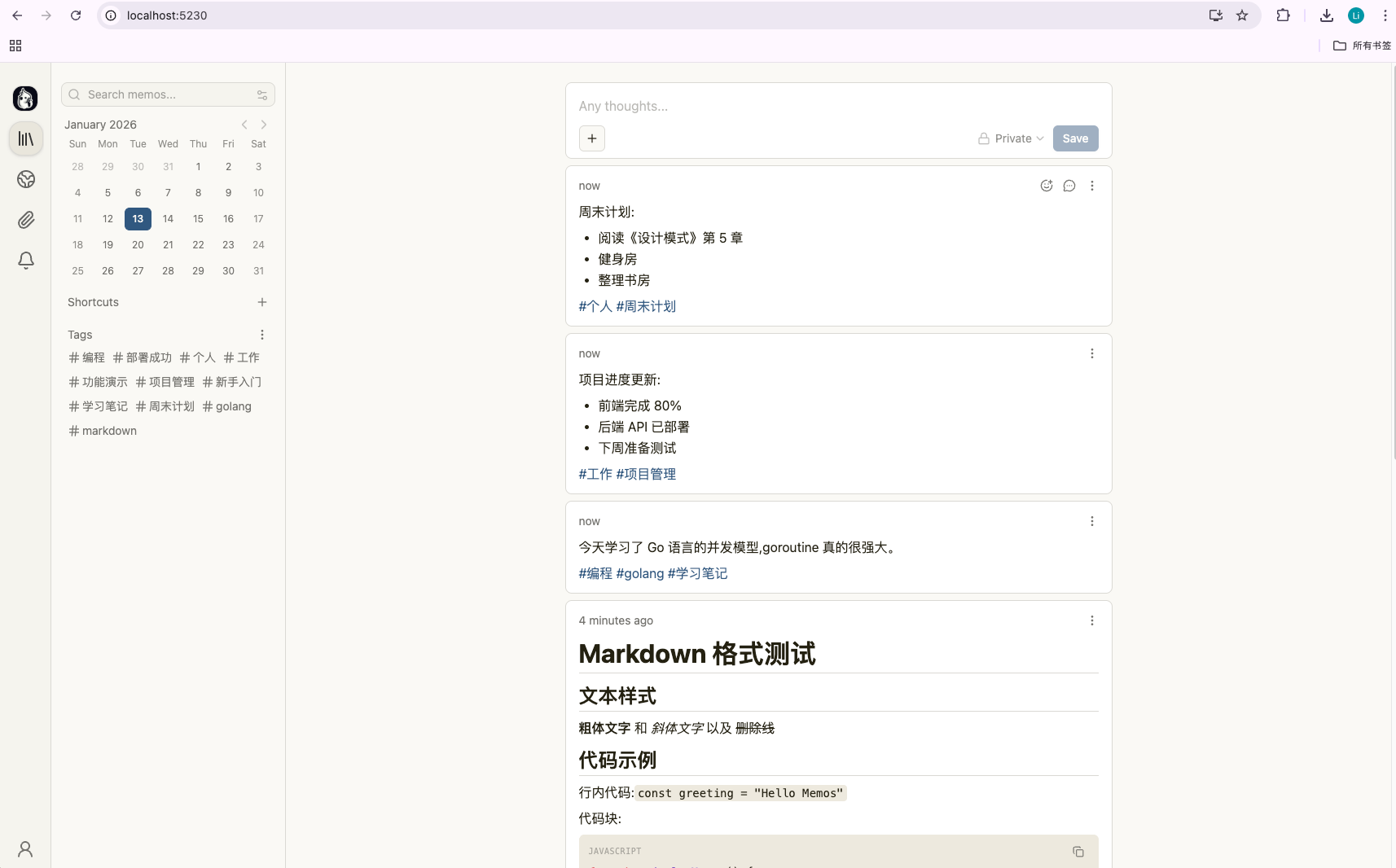 Memos 使用 Go 和 React 构建,提供闪电般的性能。Go 语言在后端的选择并非偶然: