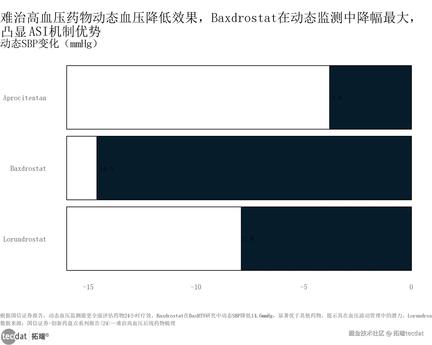 核心数据:Baxdrostat动态SBP降低14.6mmHg,远优于Lorundrostat(7.9mmHg)和Aprocitentan(3.8mmHg)。