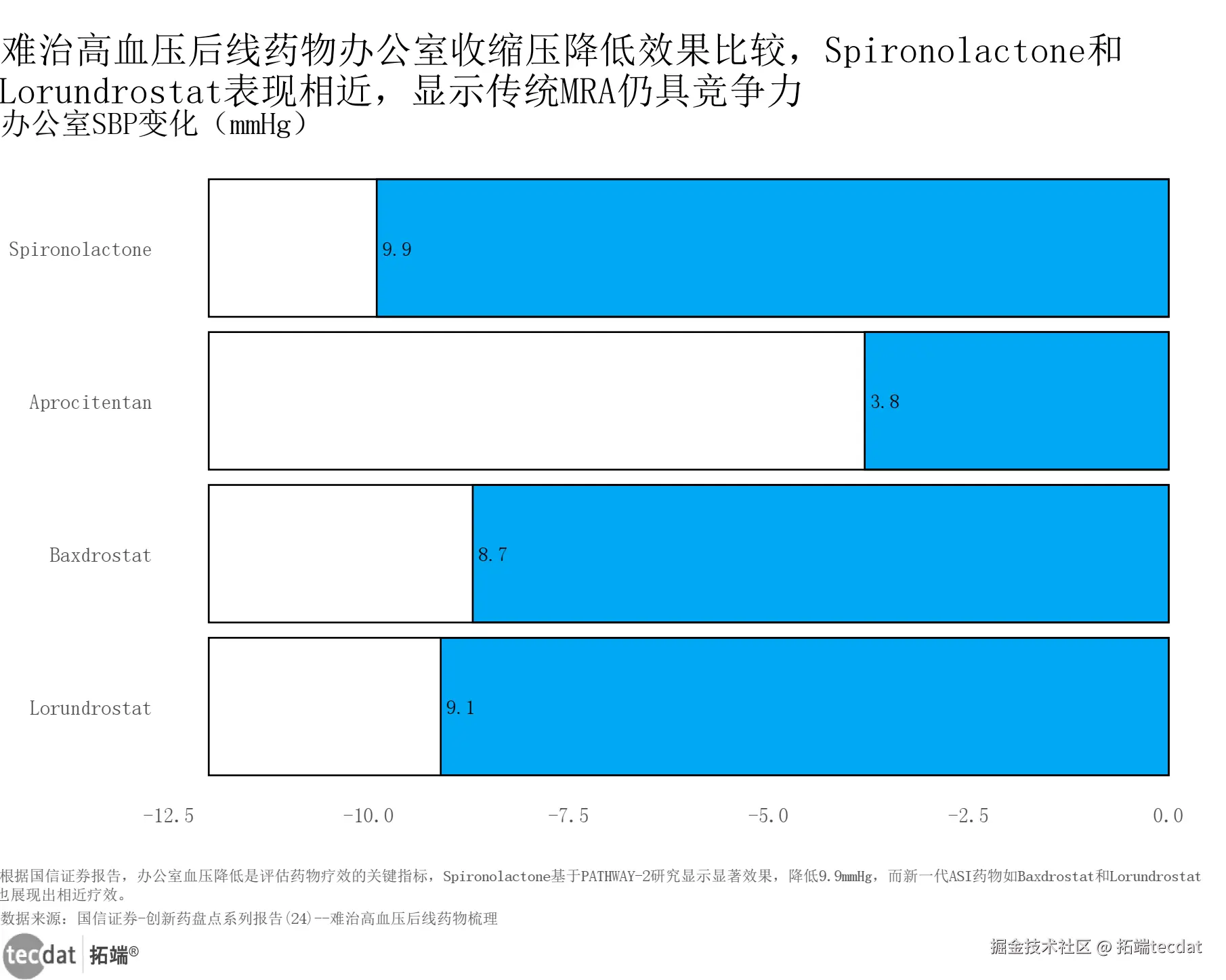 核心数据:传统MRA药物Spironolactone降压9.9mmHg,新一代ASI药物Lorundrostat 9.1mmHg、Baxdrostat 8.7mmHg,Aprocitentan 3.8mmHg。