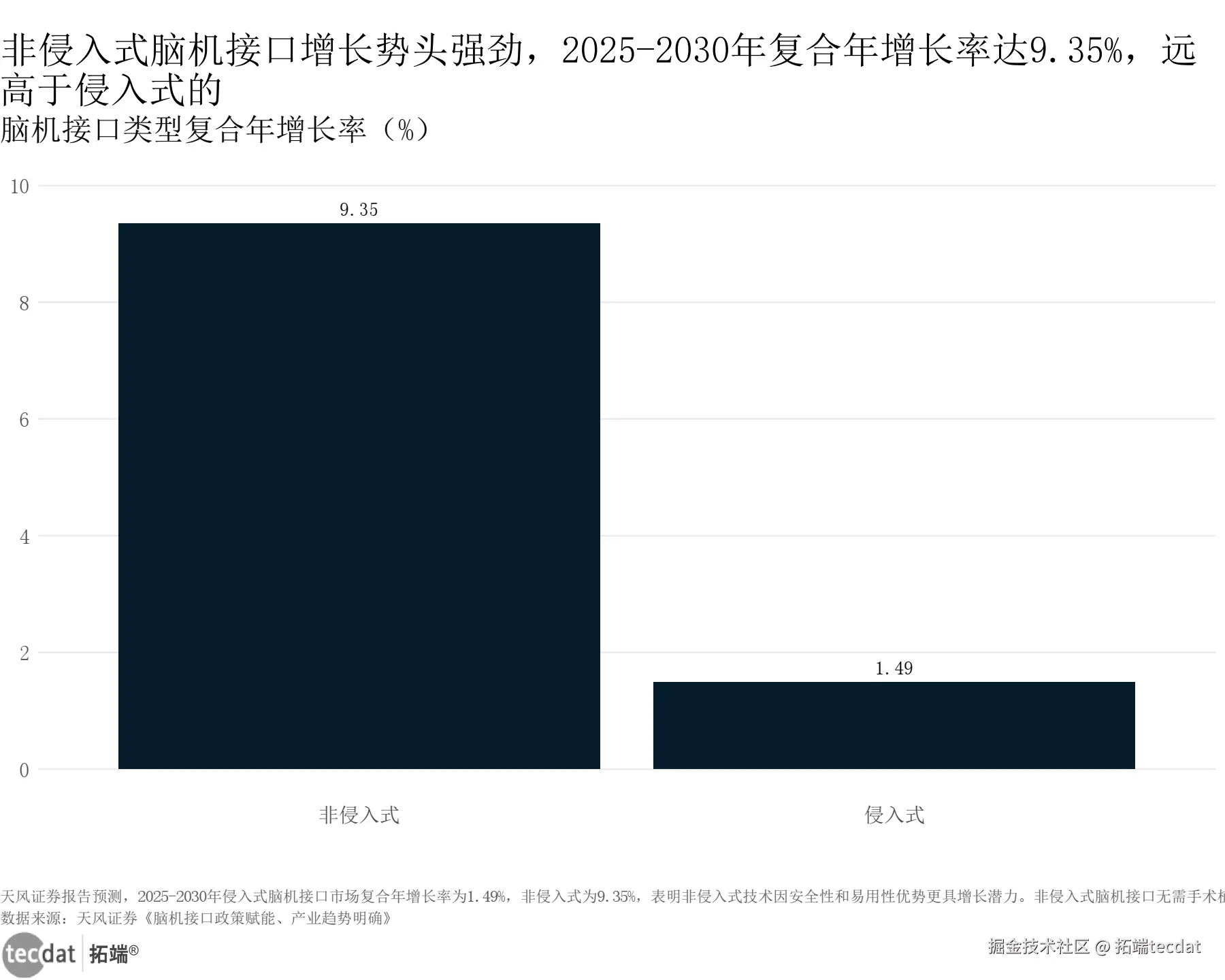 核心数据:2025-2030年非侵入式BCI复合增长率9.35%,远高于侵入式(1.49%)。