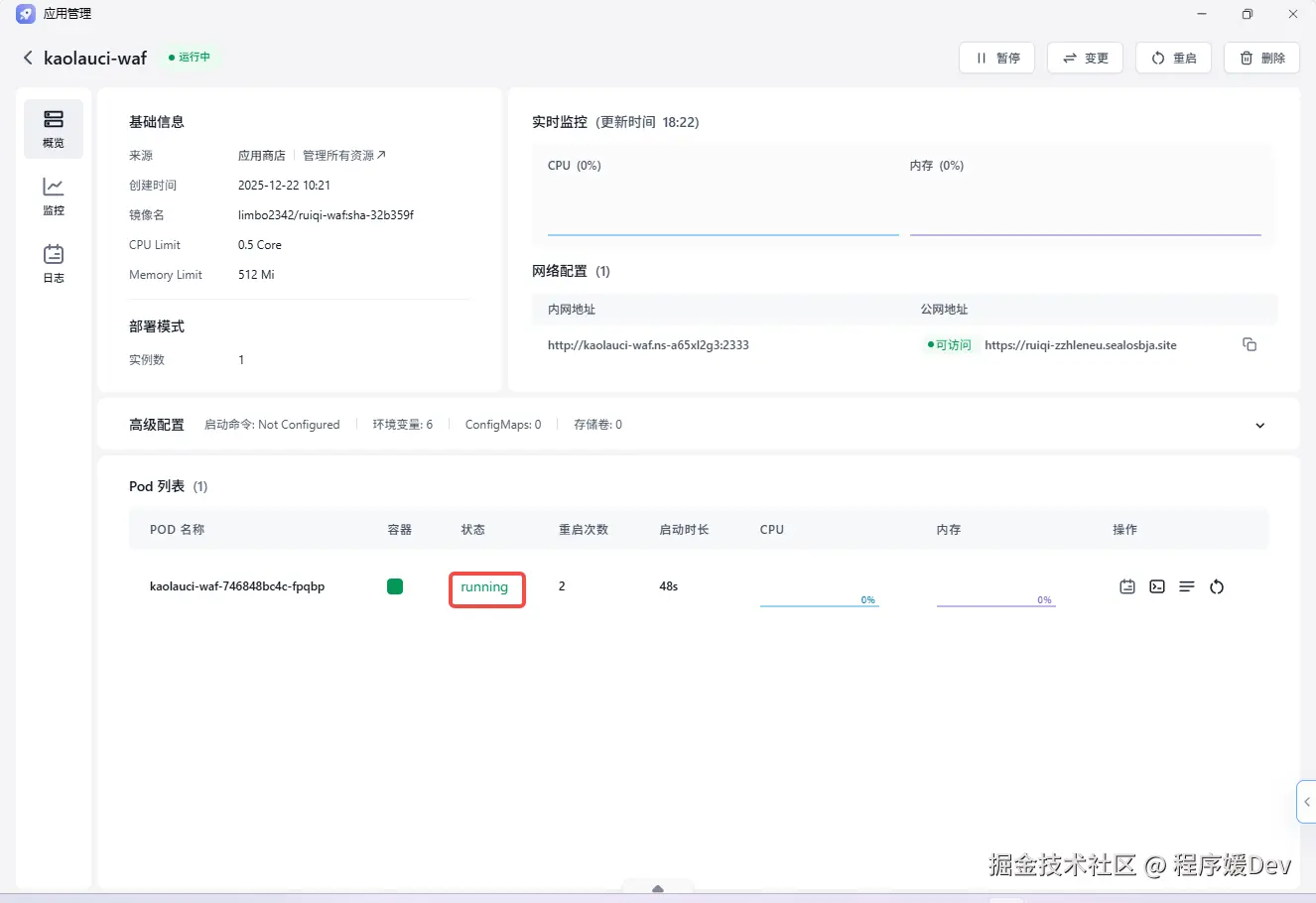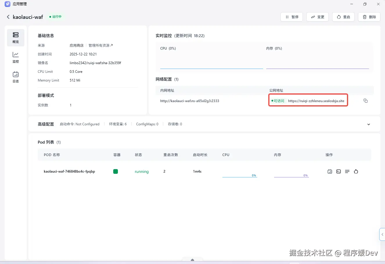 - 获取 WAF 地址: 在应用详情页的“网络”配置中,你会看到 Sealos 为你分配的一个公网访问地址。这个地址就是你的 WAF 入口。