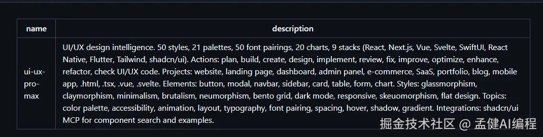 Skill 的 Description 第一段就很关键:它明确说自己是一个 UI/UX 设计智能体。