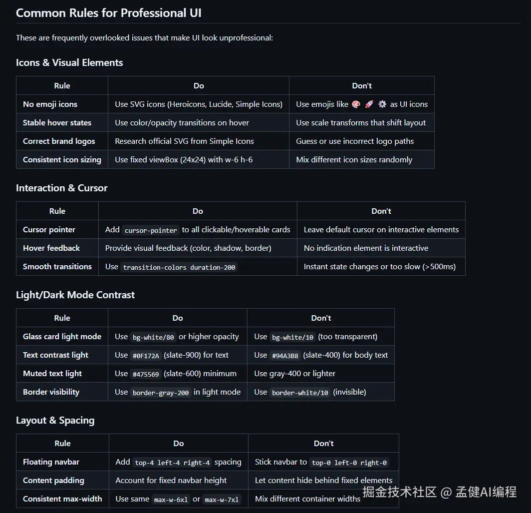 比如 AI 很爱生成 emoji 图标,这里直接规定:用 SVG icons。