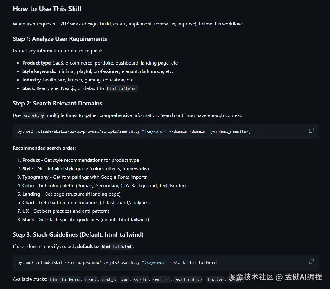 接下来我们拆一下 ui-ux-pro-max 的核心结构,你会发现它其实不神秘,只是把流程抽象了。