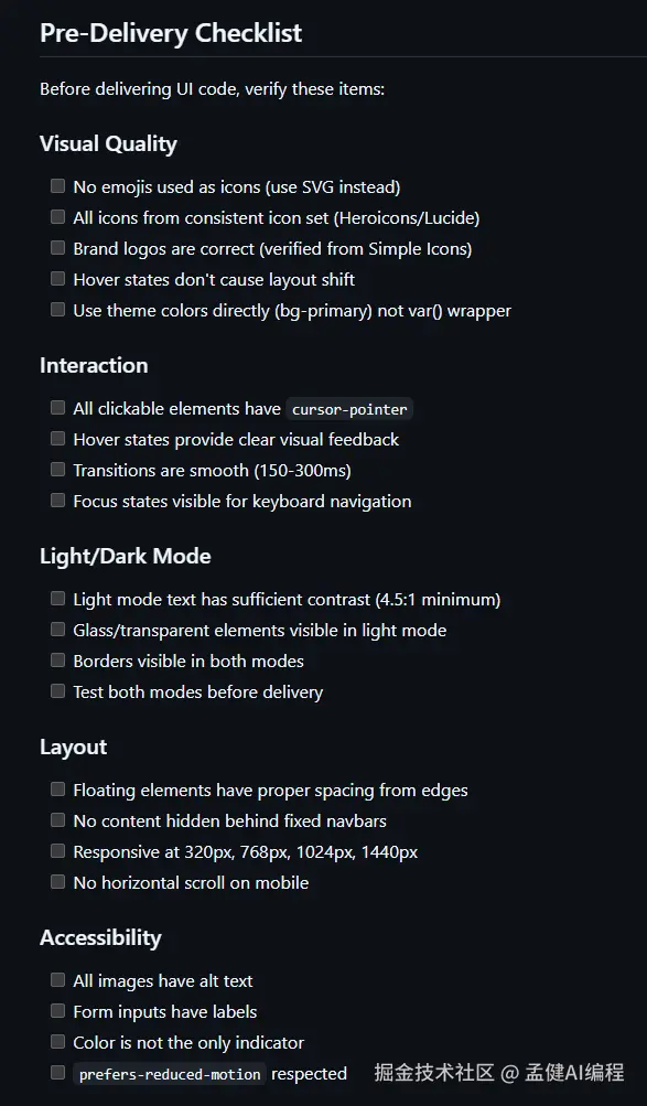 Checklist 进一步把验收流程写成了可执行的清单,从五个维度检查: