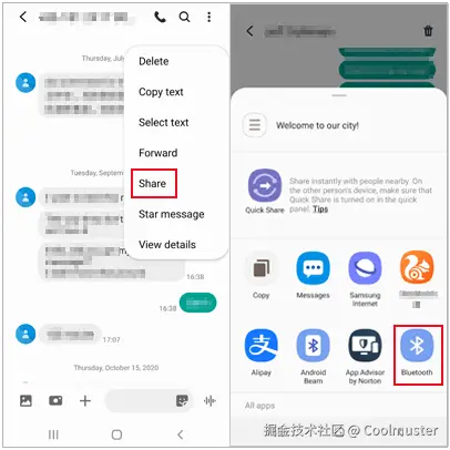 步骤3.在三星手机上,打开您想要传输的应用程序,如信息>单击一个信息组>点击您想要分享的信息>按“更多”>“分享”>“蓝牙”>vivo 的名称。