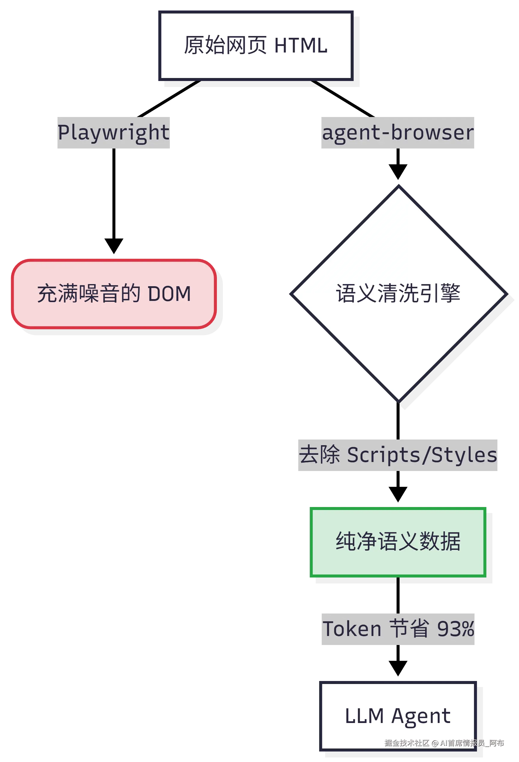 Agent Browser 方式: 它会利用无障碍树(Accessibility Tree)和语义分析,将页面转化为 LLM "喜欢" 的格式。
