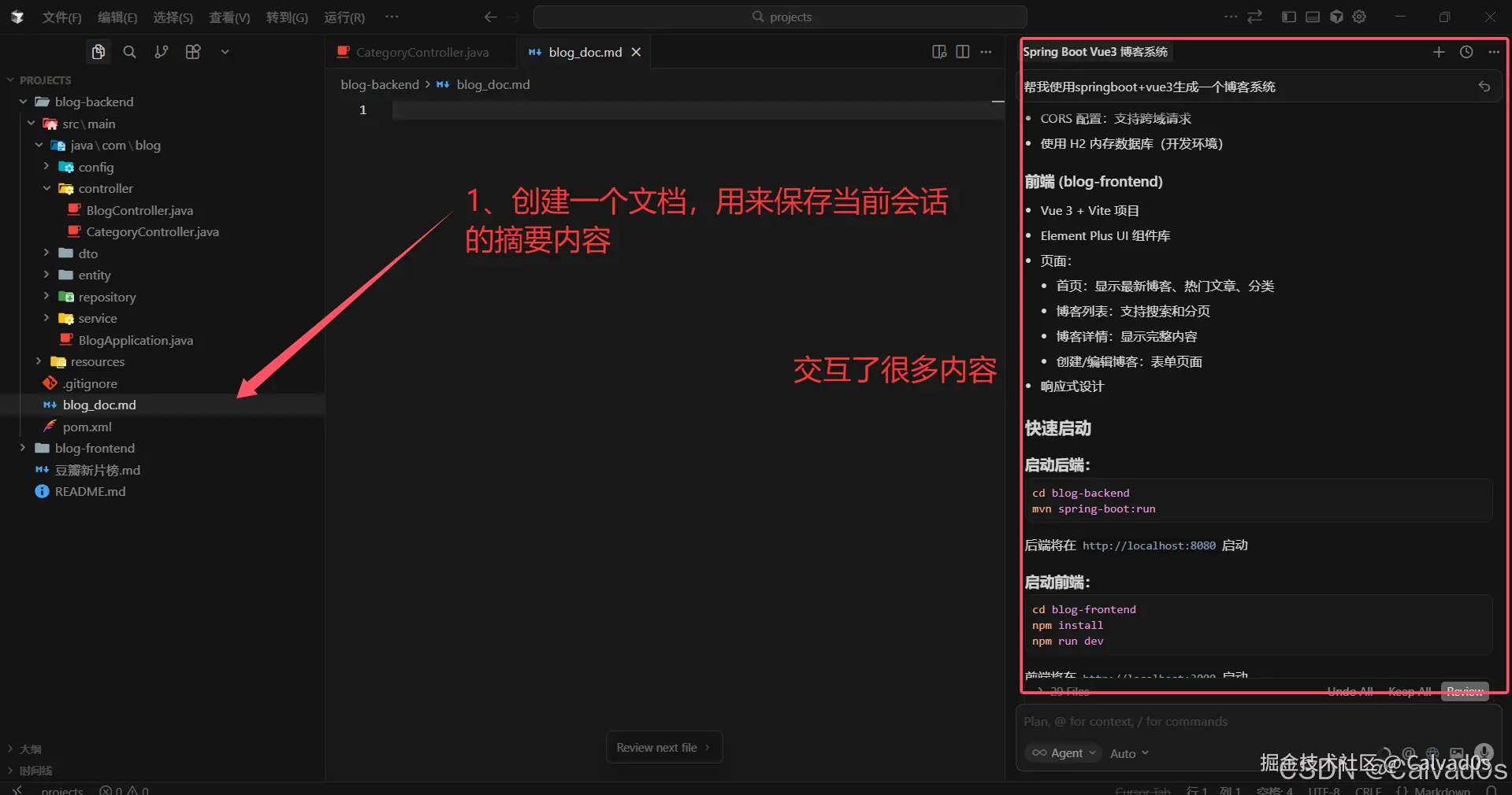 - 生成摘要文档:让AI编辑器生成当前会话的摘要,形成文档存储