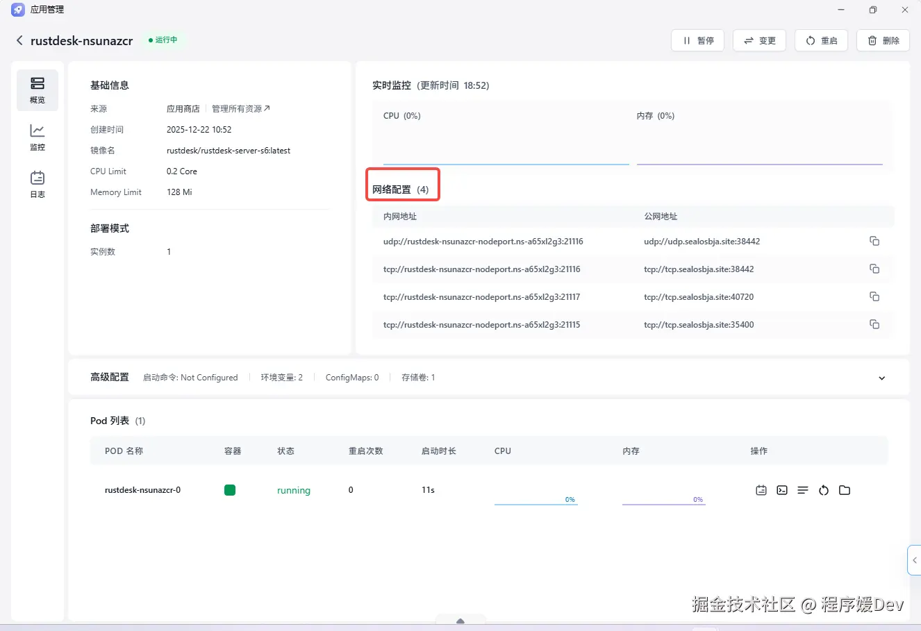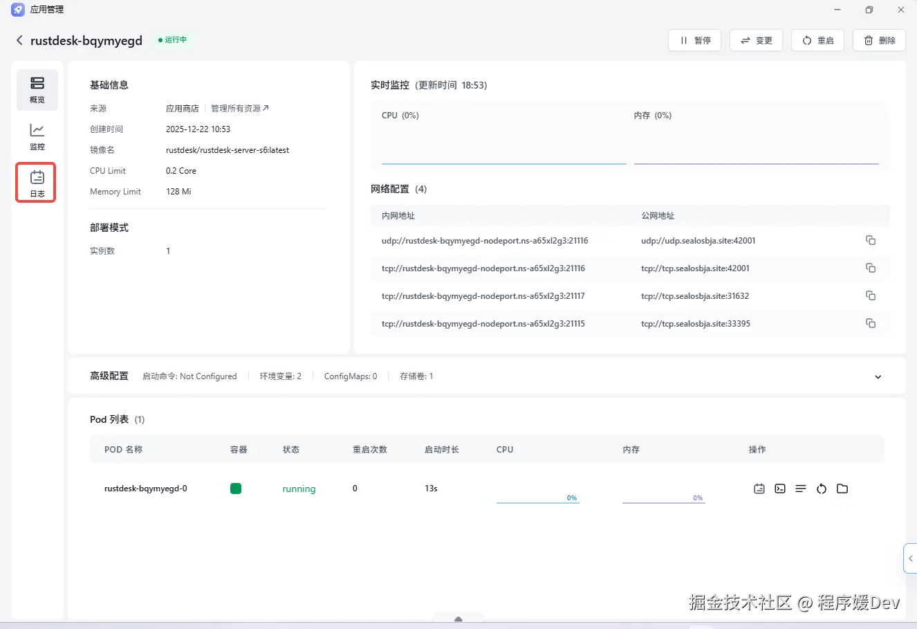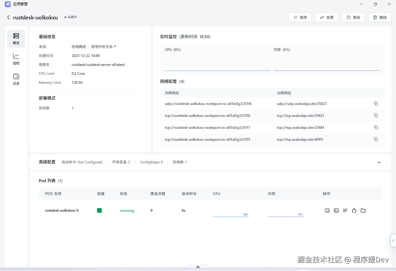 安装请求提交后,系统会自动为你完成所有配置。你只需要稍等片片刻(通常是 1-2 分钟),看到应用状态变为绿色的 Running 时,就代表你的 RustDesk 服务端已经成功上线了!