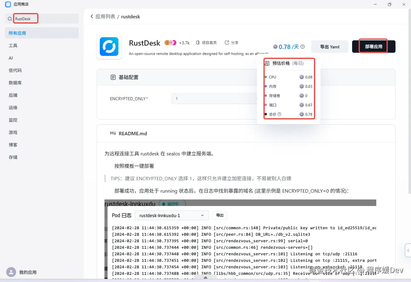在应用商店的搜索框里输入 RustDesk,找到「rustdesk-server」这个应用,直接点击卡片进入详情页。部署前,基础配置部分默认即可,无需修改。你可以清晰地看到单日预估价格,然后点击右上角的“部署应用”按钮。