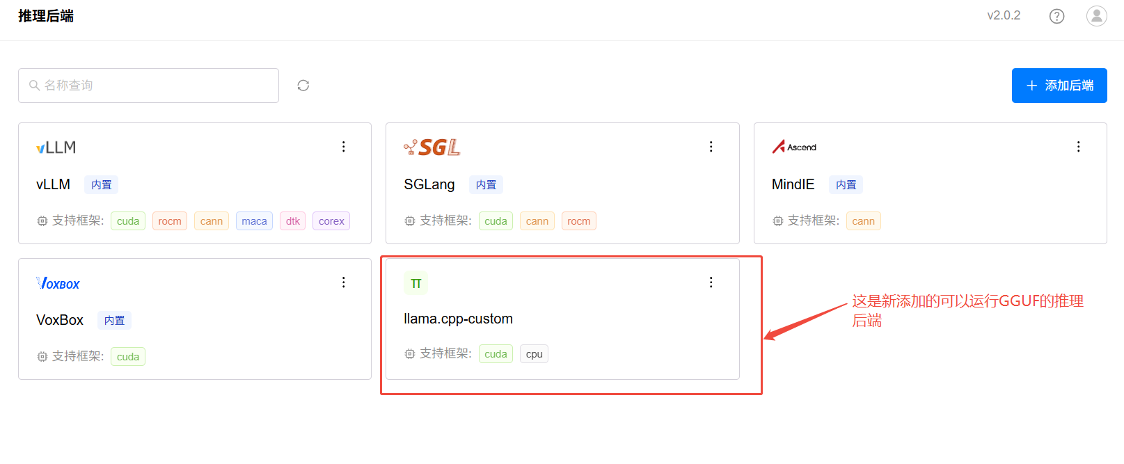 发现支持的后端有4个,但是没有看到报错提示的llama-box这个推理后端。