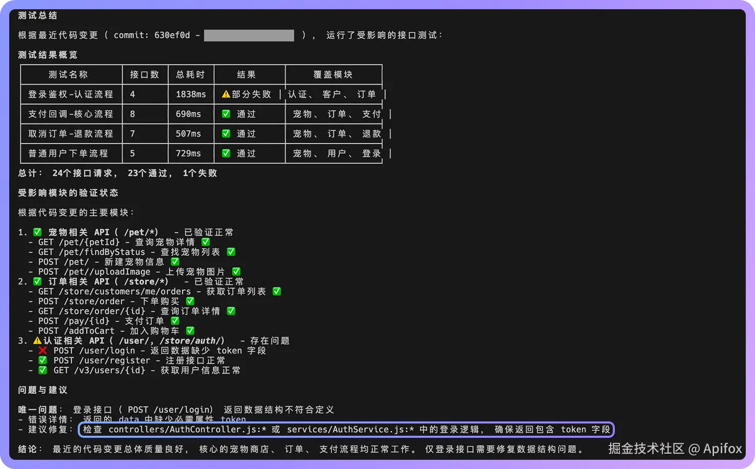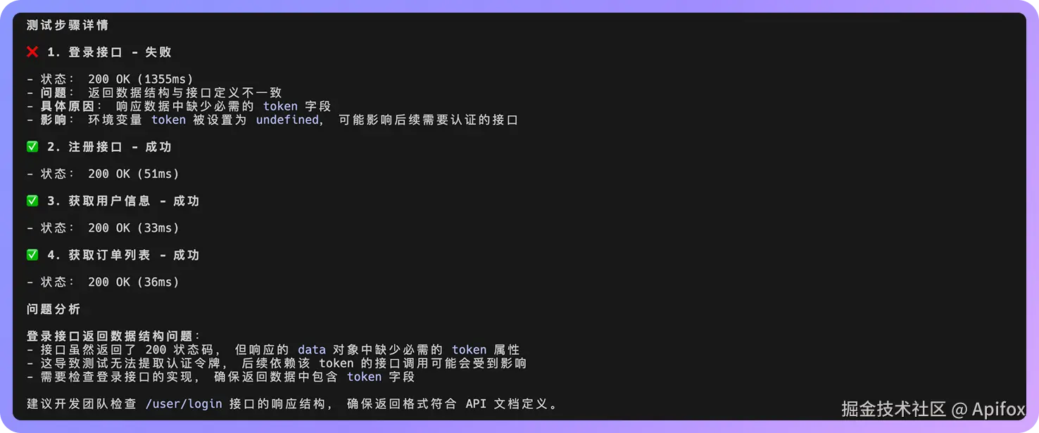 Claude 会理解你的意图,找到对应的测试文件并执行测试。在执行过程中,你会看到 Apifox CLI 的输出;测试完成后,Claude 会对结果进行分析并给出总结。