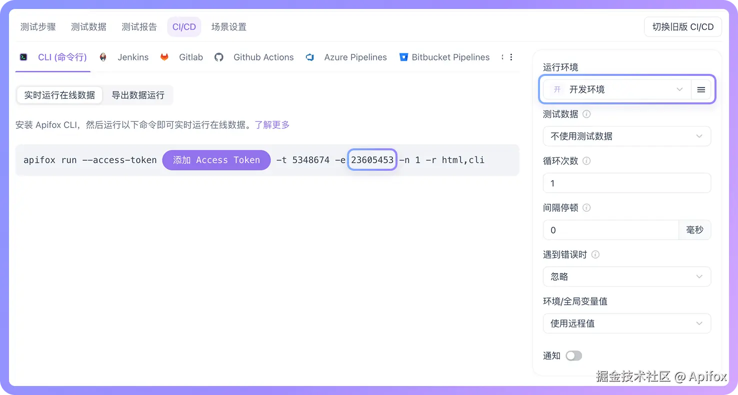 可以到 Apifox 的「自动化测试 -> CI/CD」中,复制一个“测试场景”或者“测试套件”的 CLI 命令到终端执行,记得添加 Access Token。