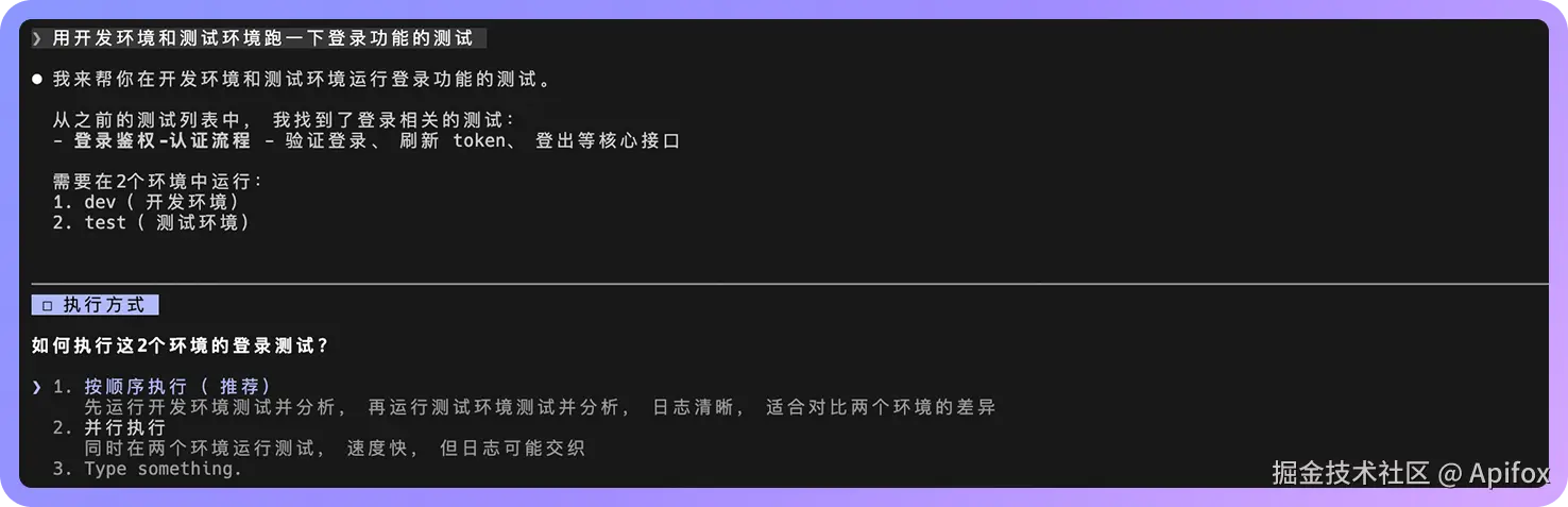 如果需要对比不同运行环境的测试结果,可以说:“用开发环境和测试环境跑一下登录功能的测试”。Claude 会在两个环境下执行测试,并帮你分析结果差异。