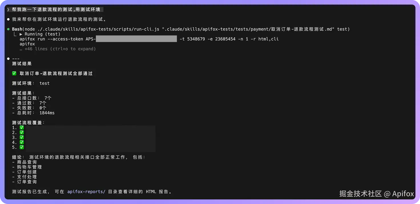 整个流程概述起来就是,你用自然语言描述需求,Claude 理解意图并调用脚本,脚本执行 Apifox CLI 命令,Claude 分析结果并反馈给你。