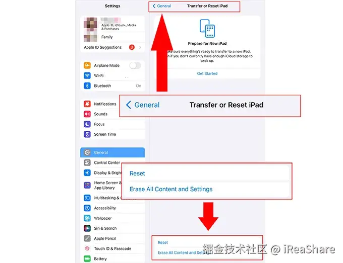 如果您使用内置的重置功能(通常称为恢复出厂设置)抹掉 iPad 上的数据,您的 Apple ID 将被删除。此功能会删除您的所有内容和自定义设置。此外,使用 iReaShare iPhone 数据擦除器以及本指南中的其他方法也可以删除 iPad 或 iPhone 上的 Apple ID。
