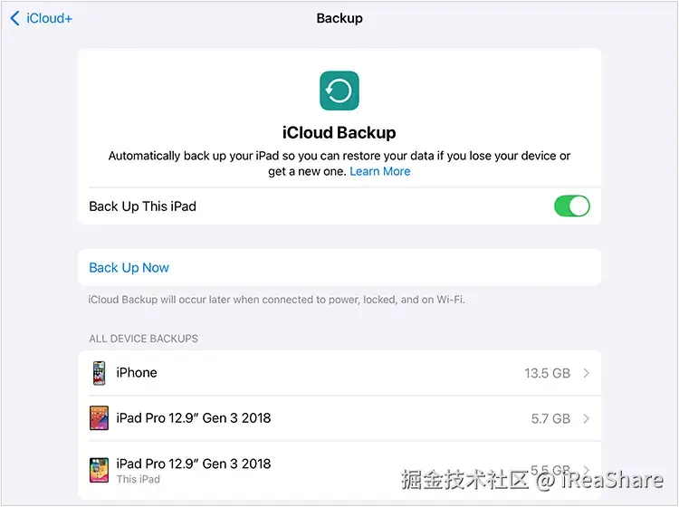 - 点击“立即备份”。然后,iPad 上的数据将备份到您的 iCloud 帐户。请确保您的云存储空间足够备份。