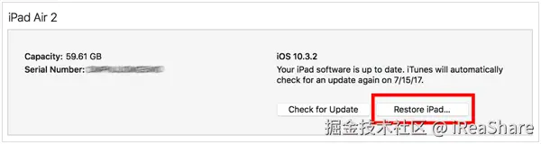 从设备列表中选择你的 iPad。在“摘要”选项卡(iTunes)或“通用”选项卡(Finder)中,点击“恢复 iPad ”。
