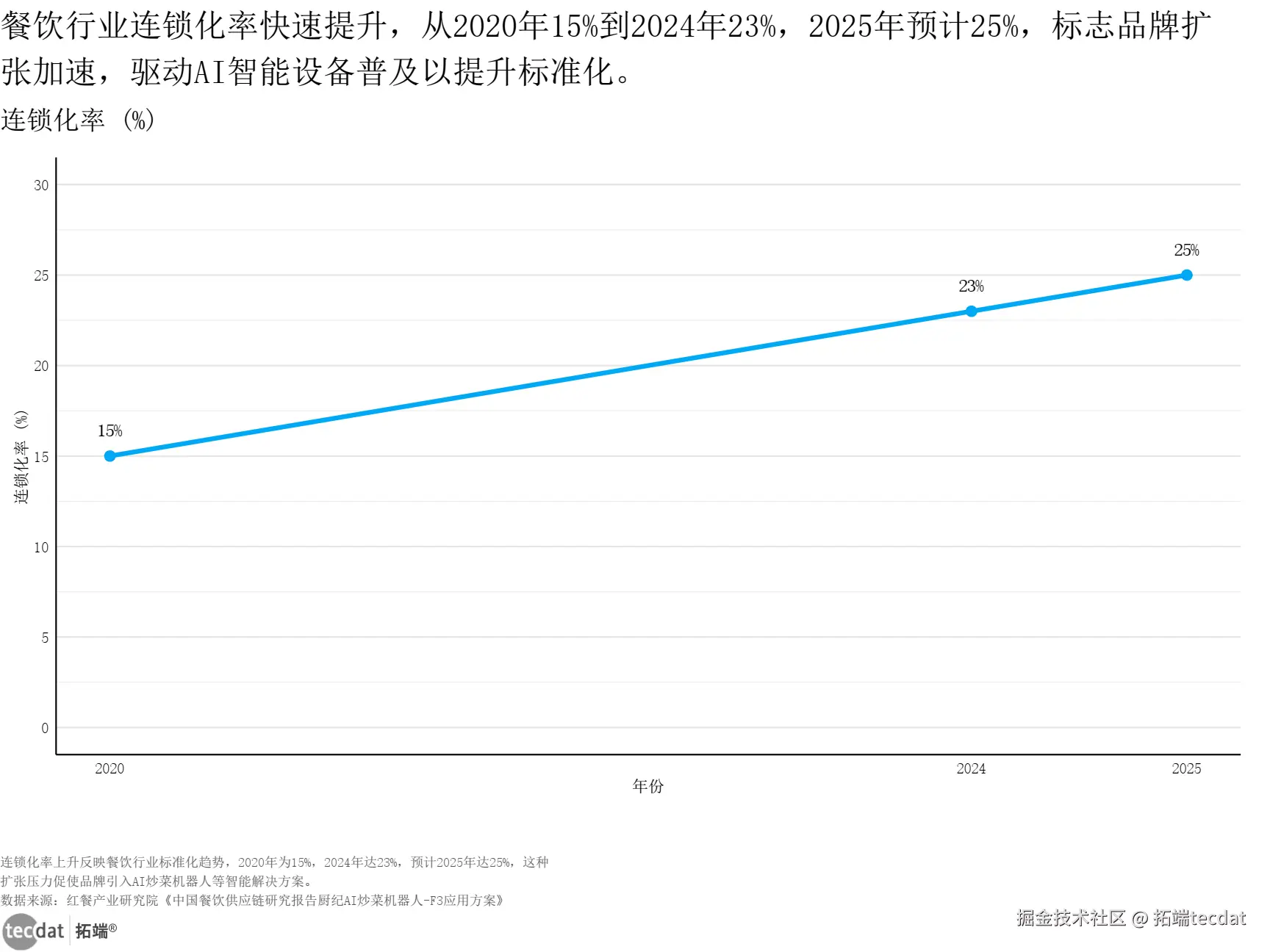 注释:连锁化率上升反映餐饮行业标准化趋势,2020年为15%,2024年达23%,预计2025年达25%,这种扩张压力促使品牌引入AI炒菜机器人等智能解决方案。来源: 红餐产业研究院《中国餐饮供应链研究报告厨纪AI炒菜机器人-F3应用方案》。