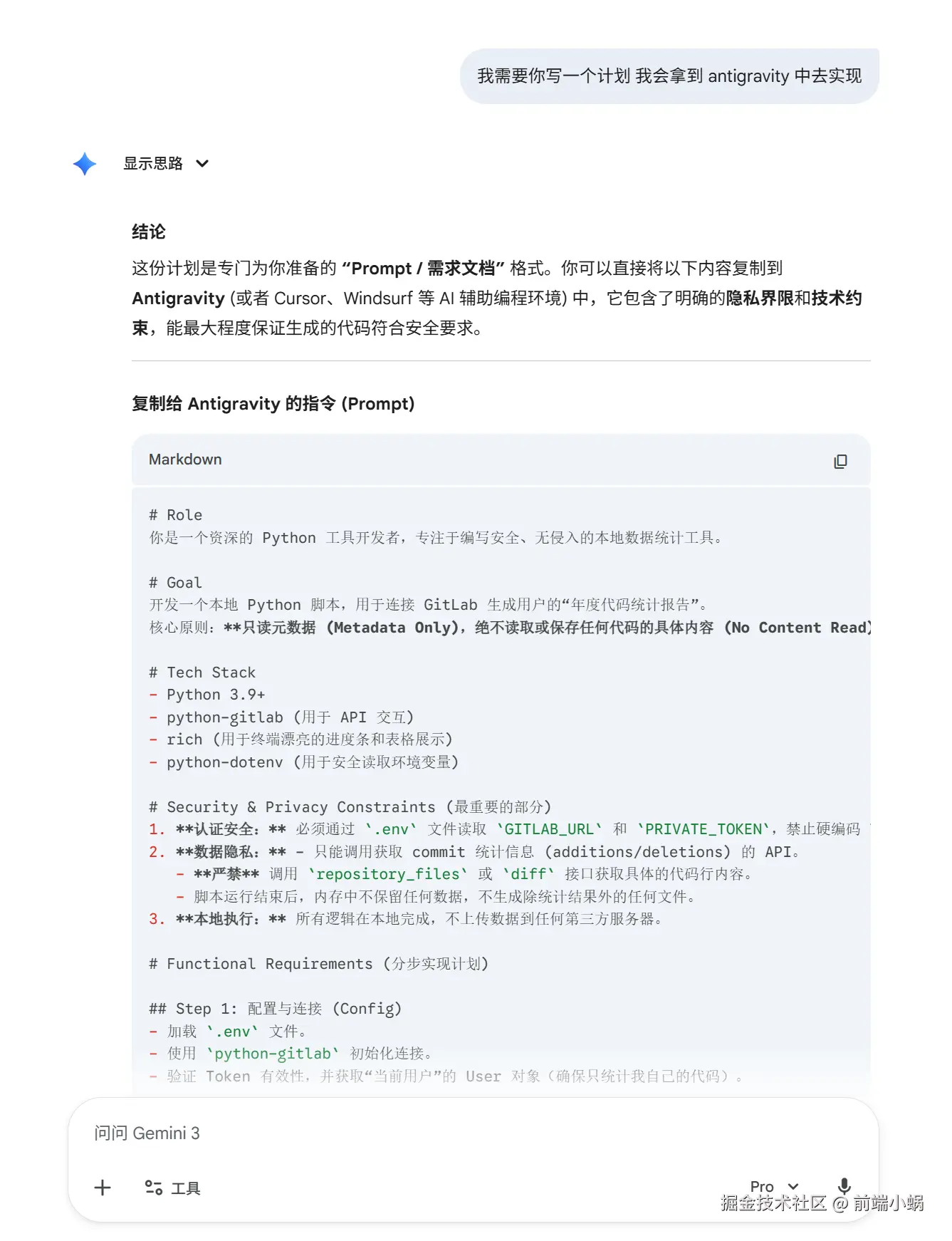 我反手就是一个 Prompt 甩过去,着重强调了我的 “安全洁癖”:必须只通过 .env 读 Token,严禁调用 repository_files 这种危险接口。