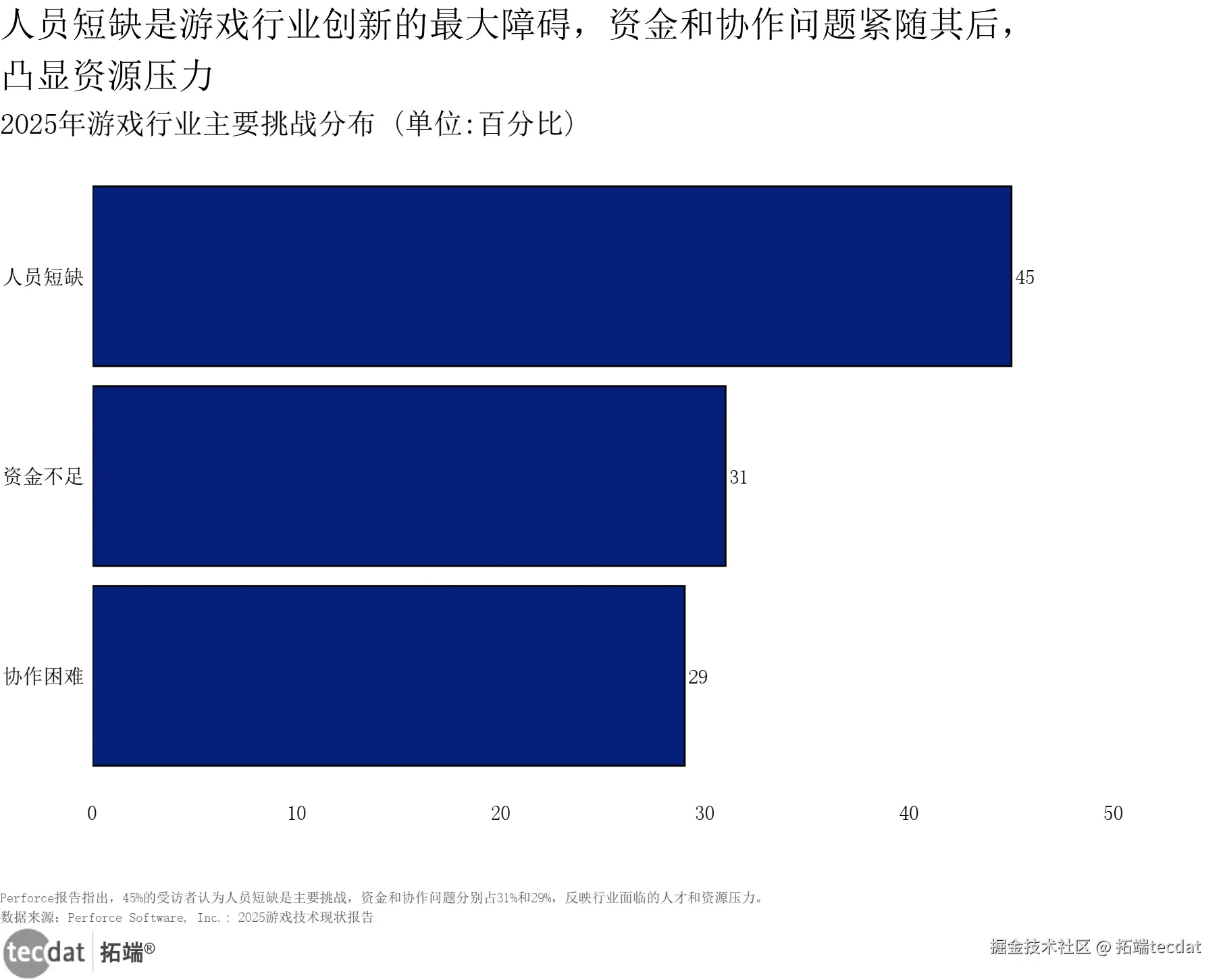 行业增长背后,挑战与机遇并存。人员短缺成为创新最大障碍(45%受访者提及),人才缺口制约行业创新;资金不足(31%)与协作困难(29%)紧随其后,成为中小团队的主要痛点。不同规模团队面临的难题各异:小型团队侧重提升协作效率,大型团队则面临时间紧迫与规模化管理的双重压力。
