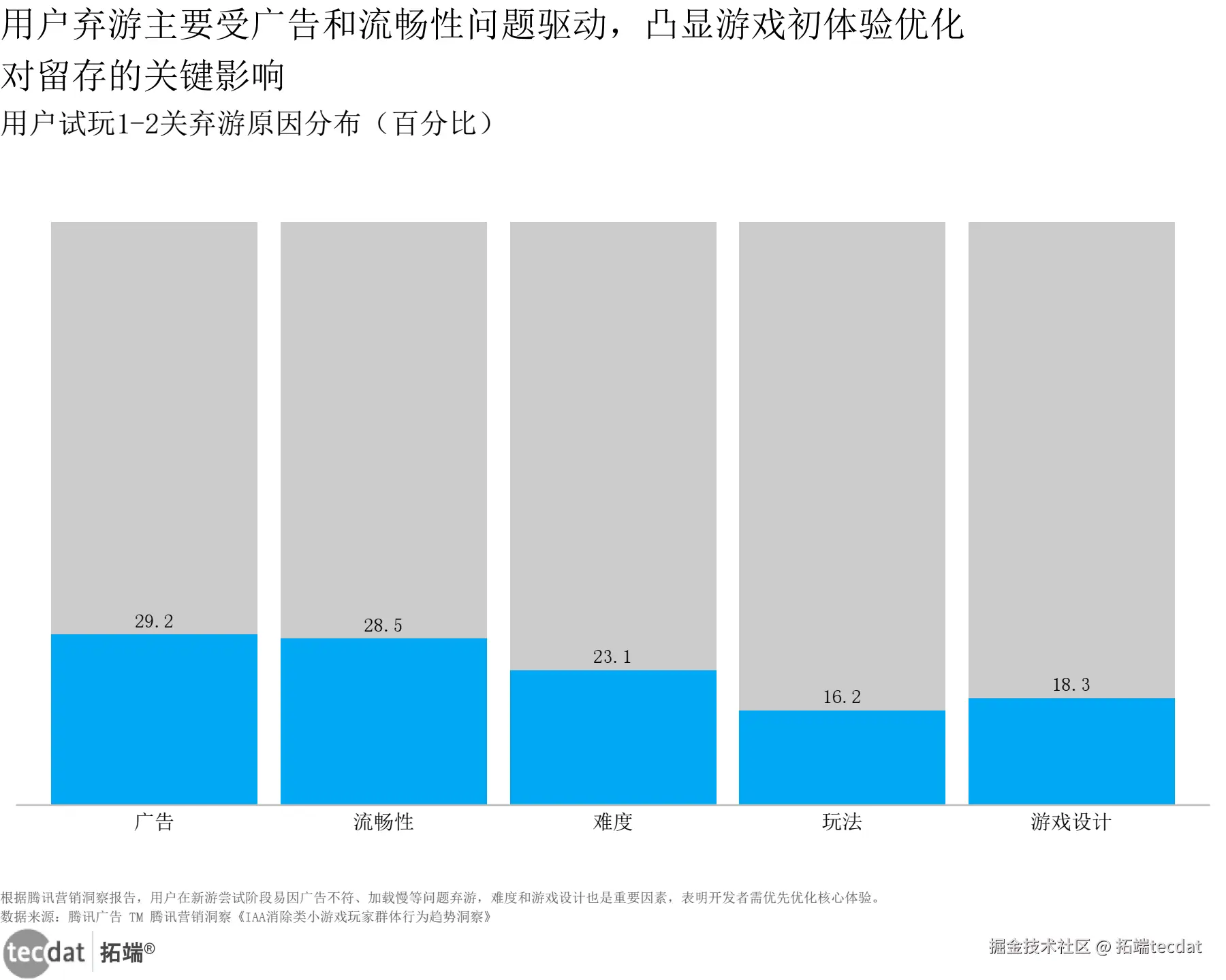| 新游试玩1-2关弃游用户比例 | 91.5% | 腾讯广告&腾讯营销洞察《IAA消除类小游戏玩家群体行为趋势洞察》 |