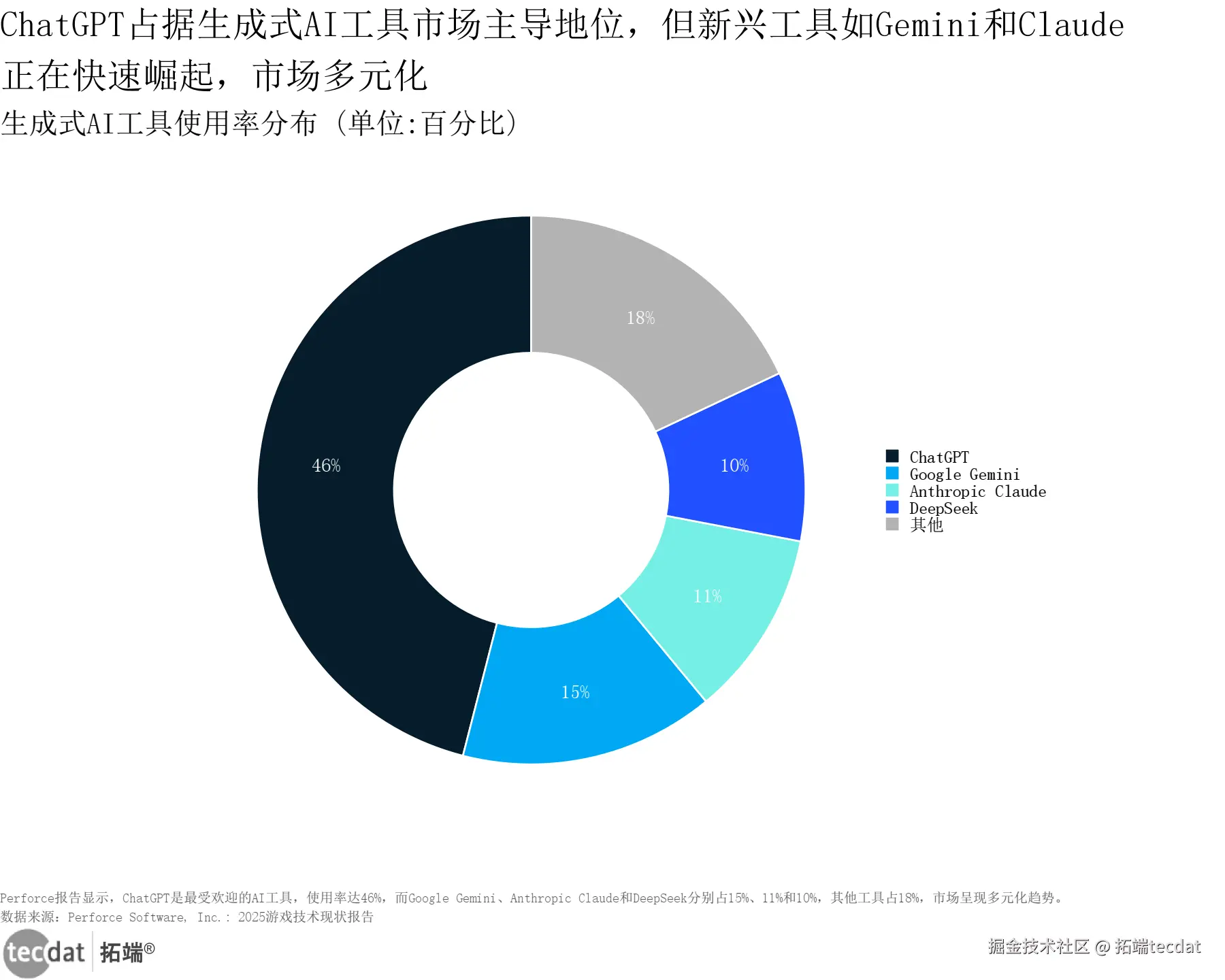 生成式AI已成为游戏行业的“效率革命引擎”,70%的受访者将其纳入工作流程,其中媒体与娱乐行业使用率高达86%,远超整体水平,成为AI应用的核心试验场。工具市场呈现“一超多强”格局,ChatGPT以46%的使用率领跑行业,Google Gemini(15%)、Anthropic Claude(11%)、DeepSeek(10%)快速崛起,差异化功能抢占细分场景。