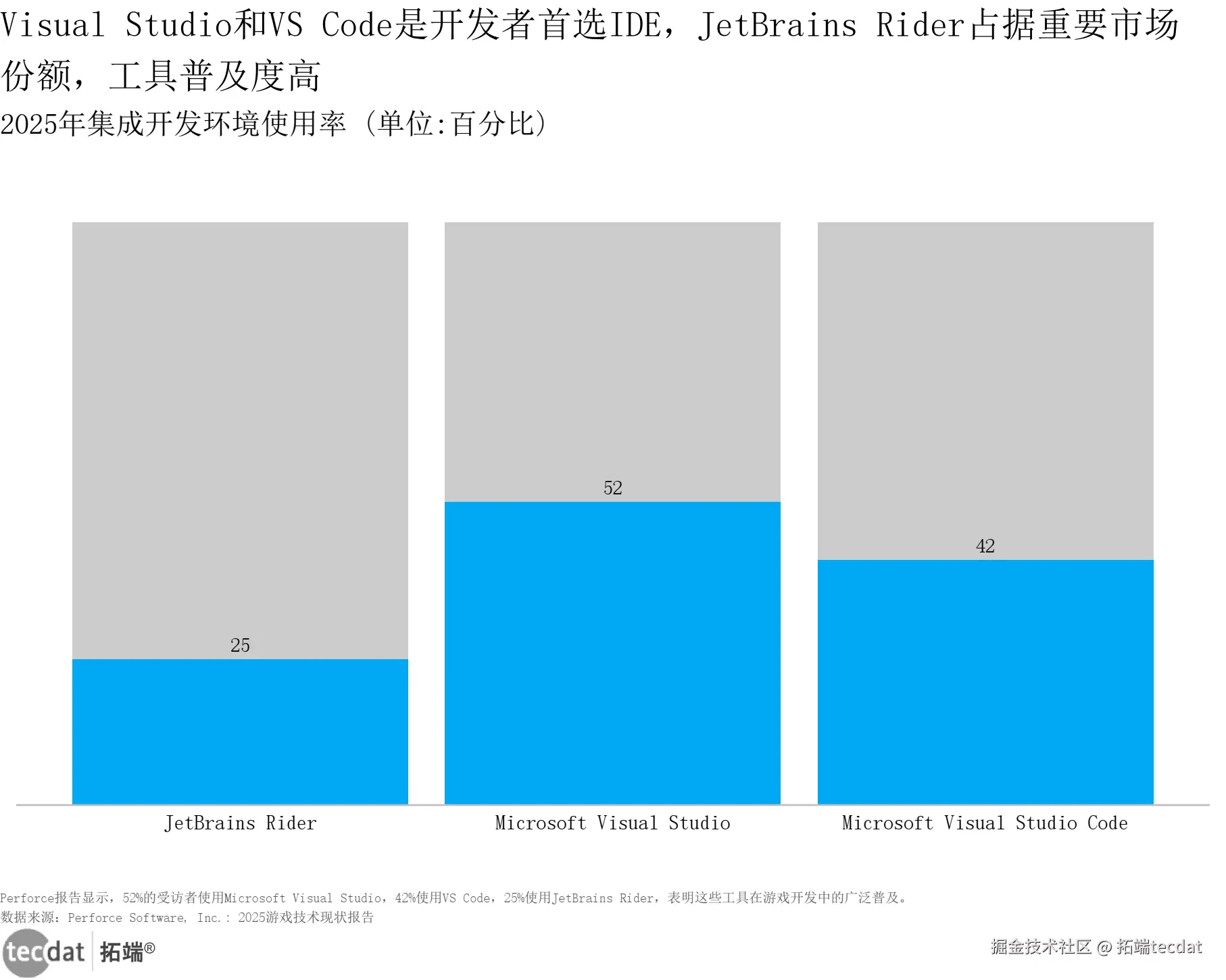 集成开发环境(IDE)市场格局稳定,“头部工具+生态适配”成为主流选择。Microsoft Visual Studio以52%的使用率位居第一,Microsoft Visual Studio Code(42%)、JetBrains Rider(25%)分列二三位,成为开发者日常工作的核心工具,其普及性降低了行业学习成本,让中小团队更易入局。