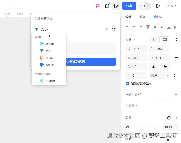 - 点击 Pixso 编辑器右上角的“设计稿转代码”,代码类型选择 Vue 3。