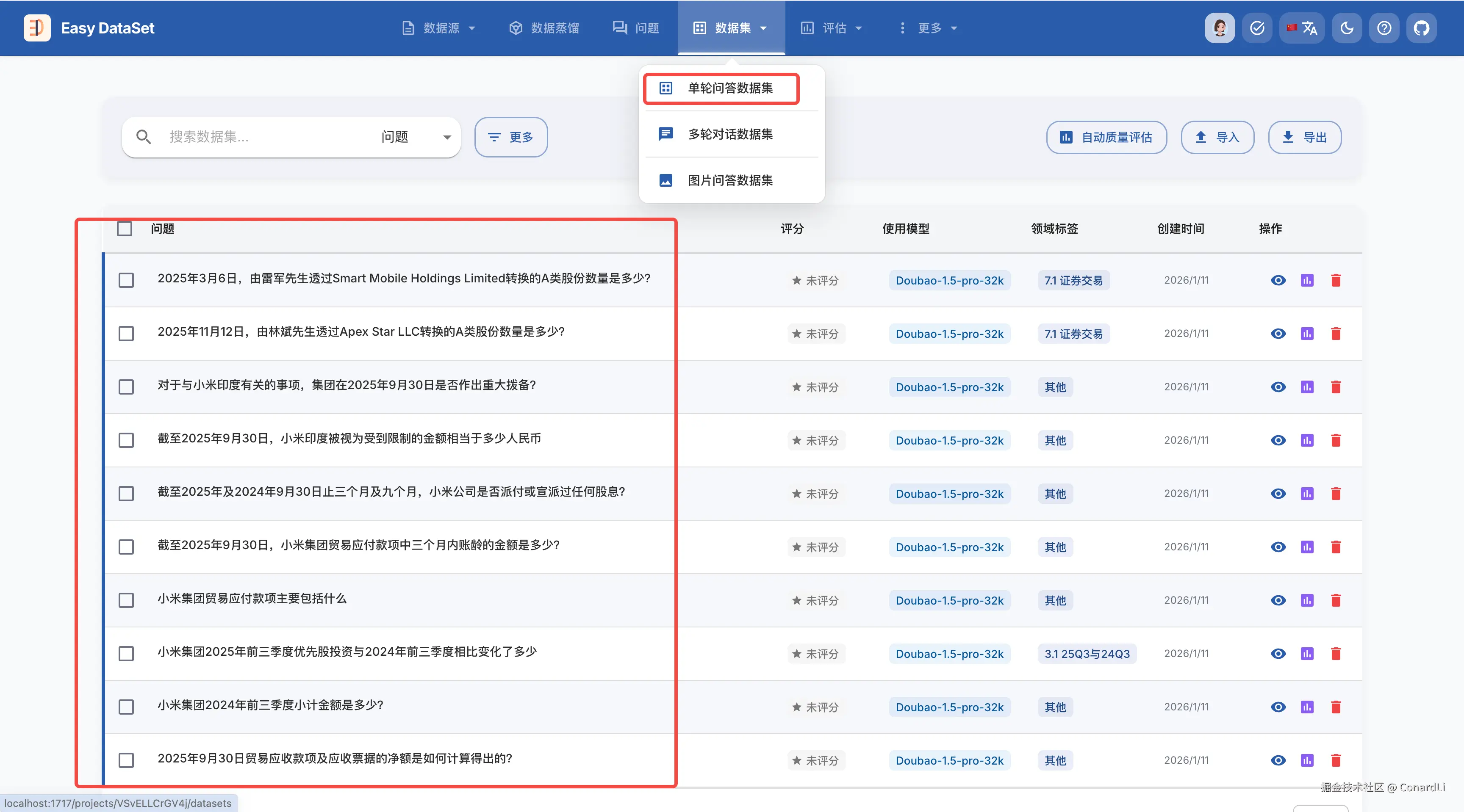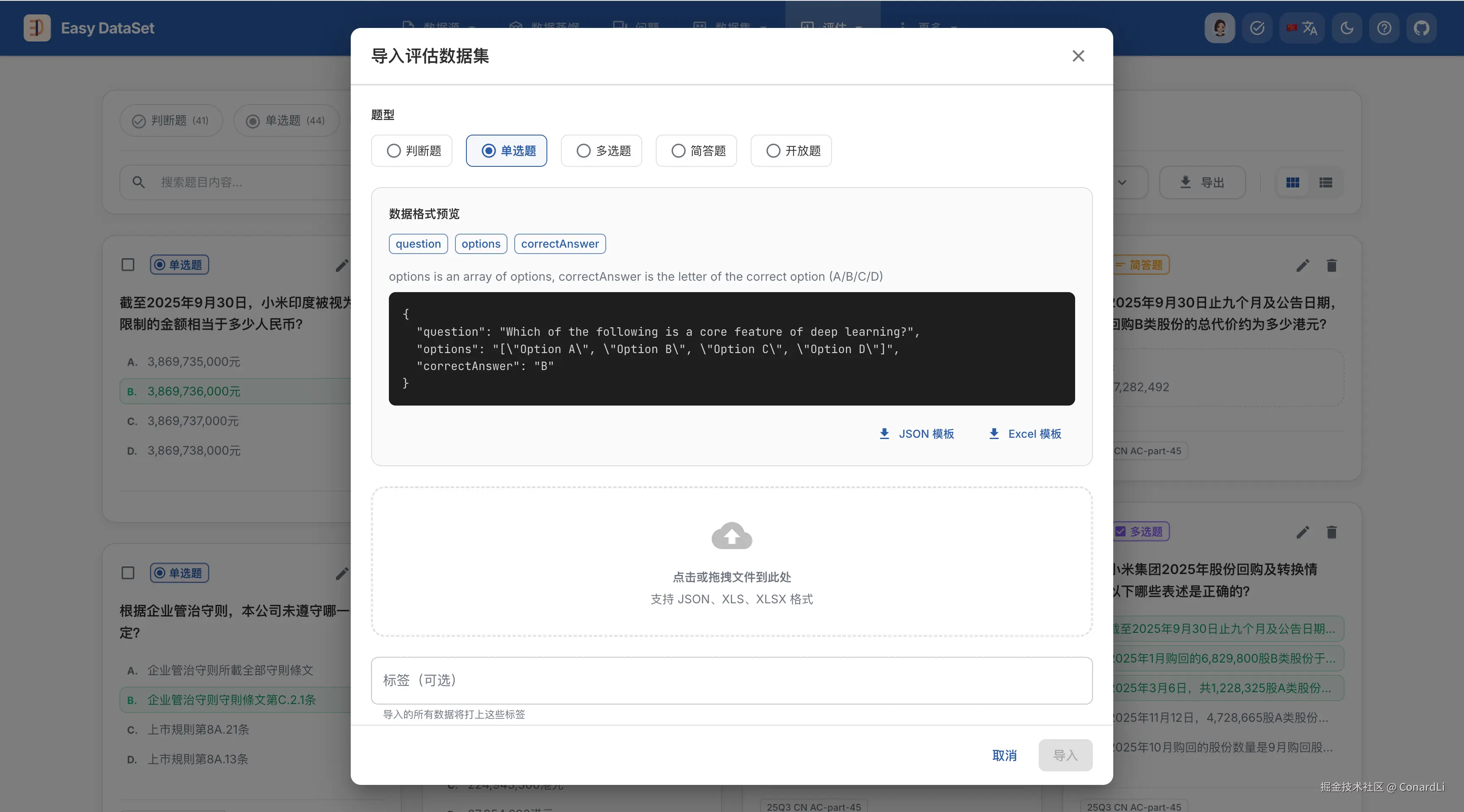 在以前的项目中,你可能已经使用 Easy Dataset 生成过数据集(训练集),我们也支持直接从已有数据集上标注和生成测试集。