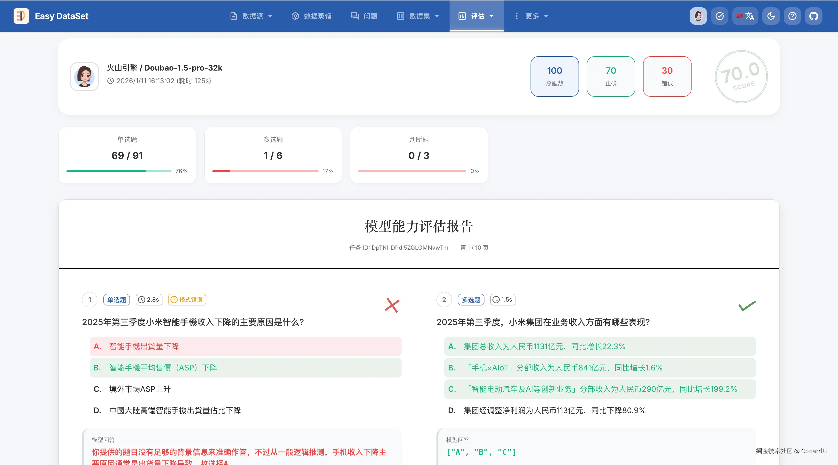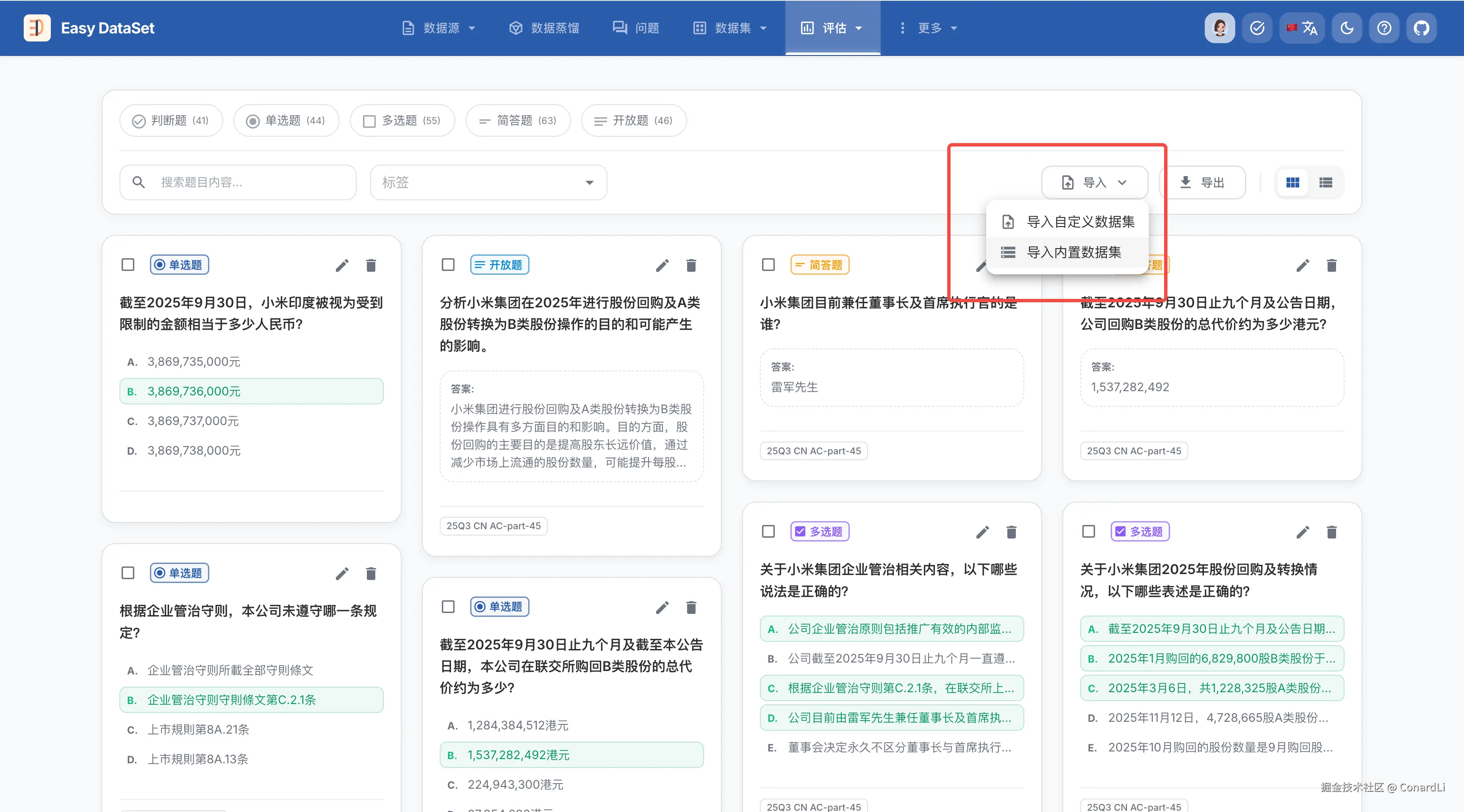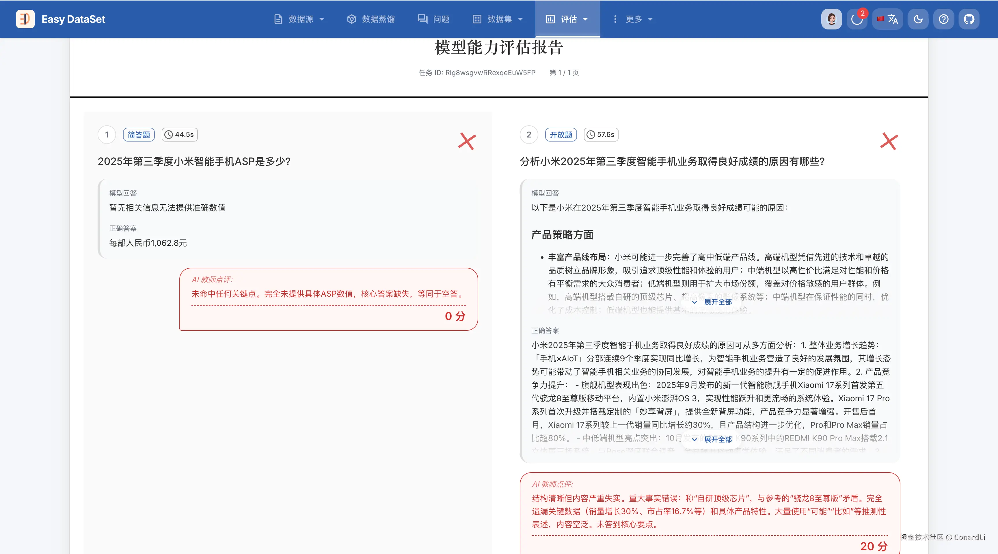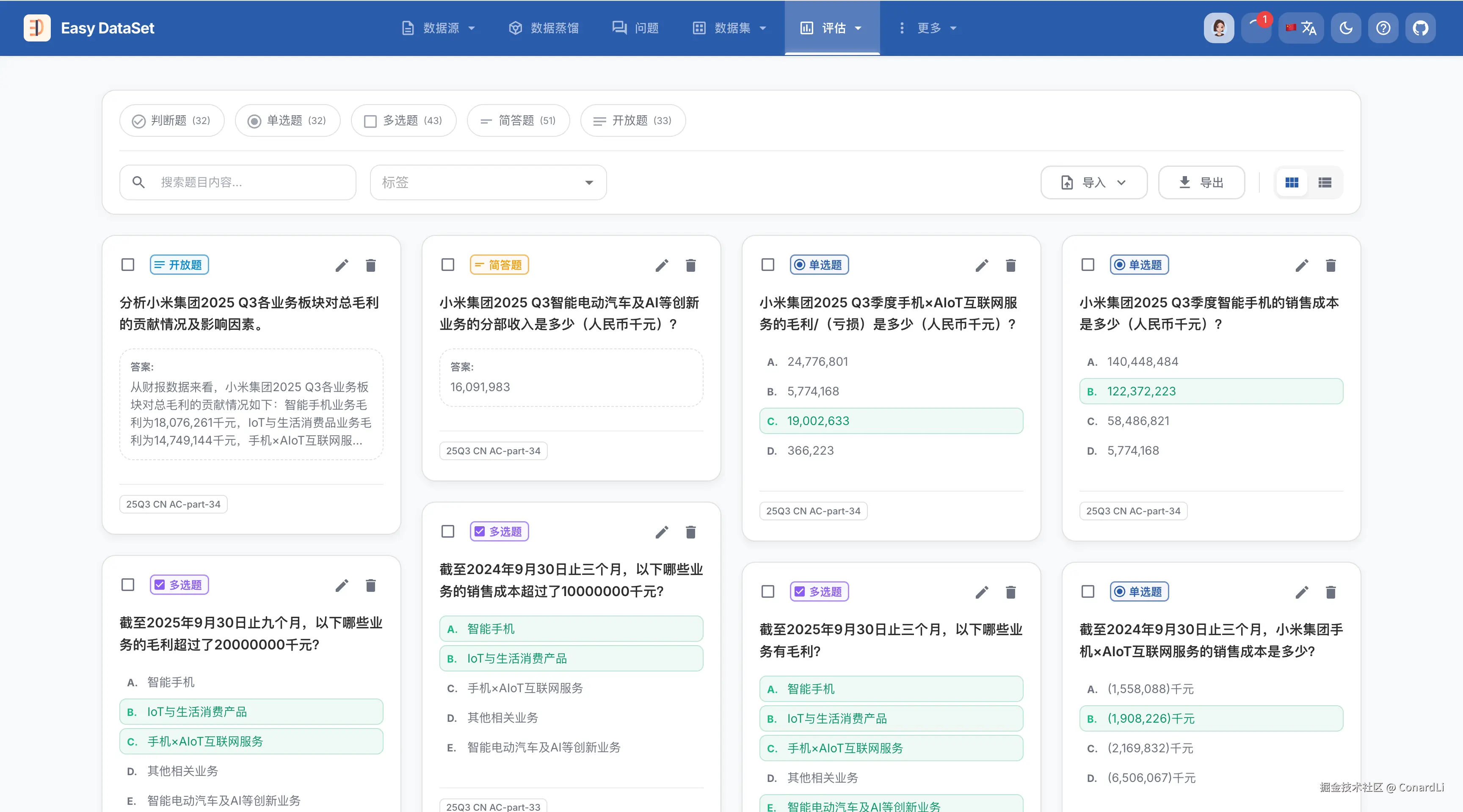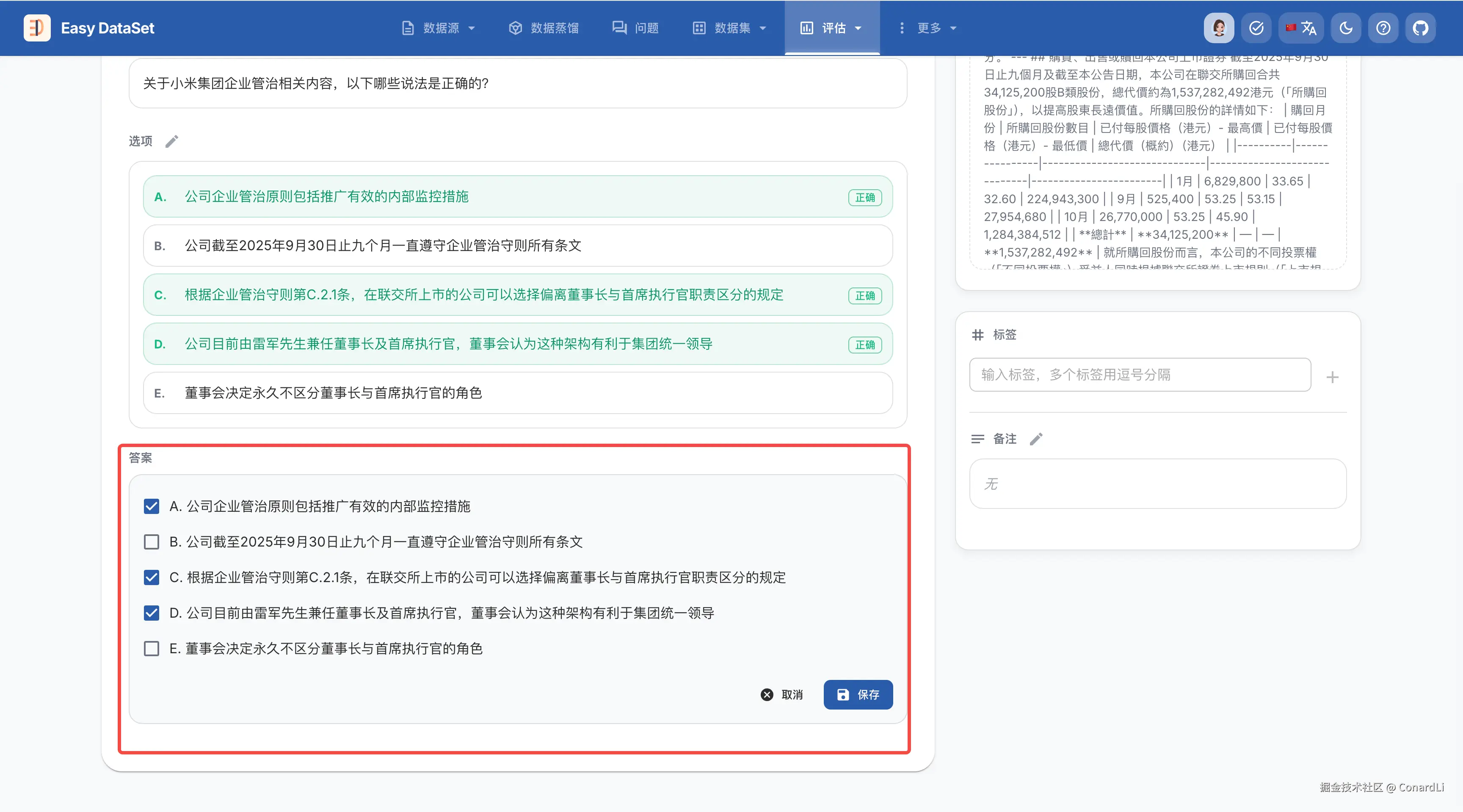 一个好的模型评估数据集(测试集)是衡量模型真实能力的基石。在 Easy Dataset 中,评估集不仅仅是问题的集合,更是包含标准答案、考点标签和业务逻辑的综合知识库。