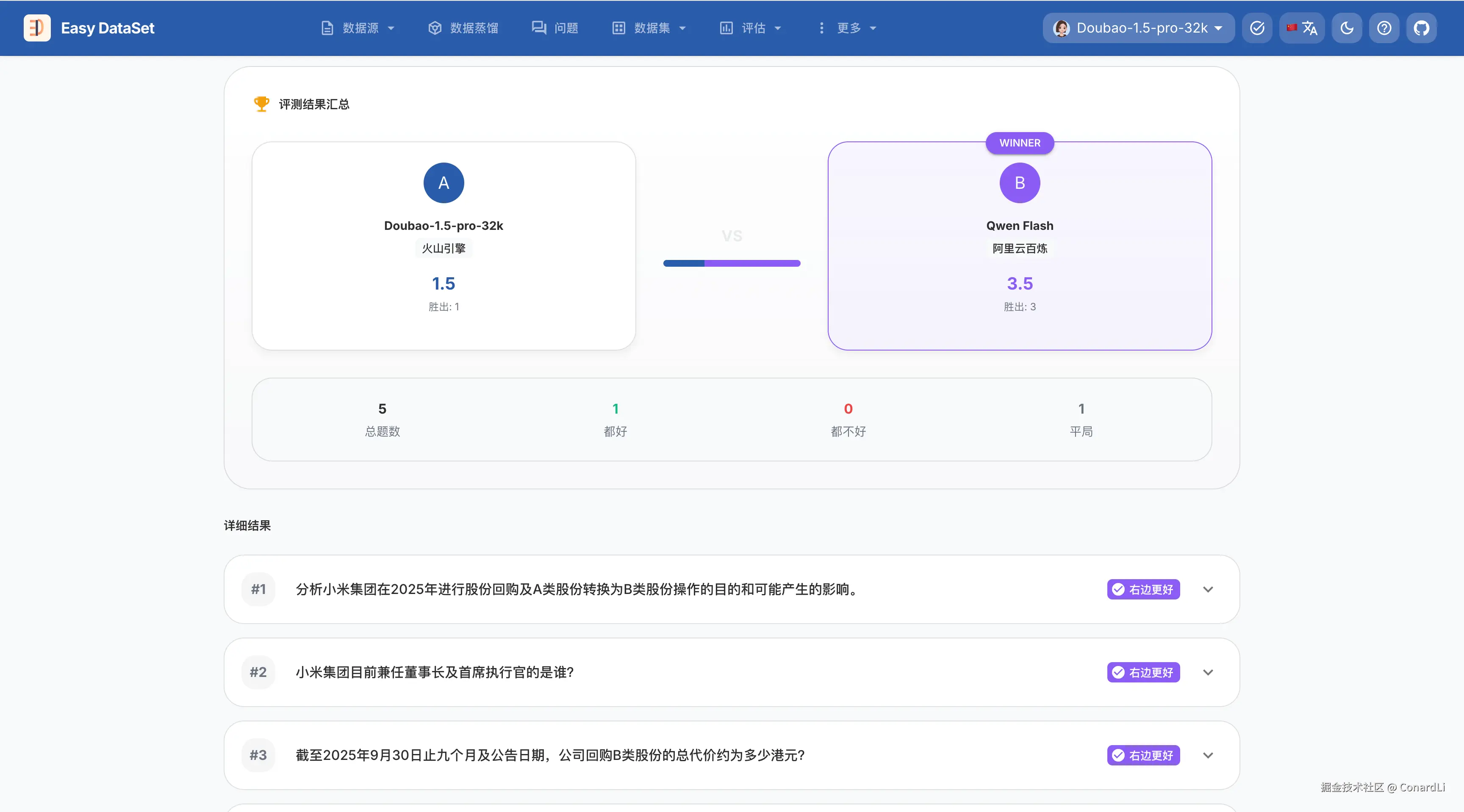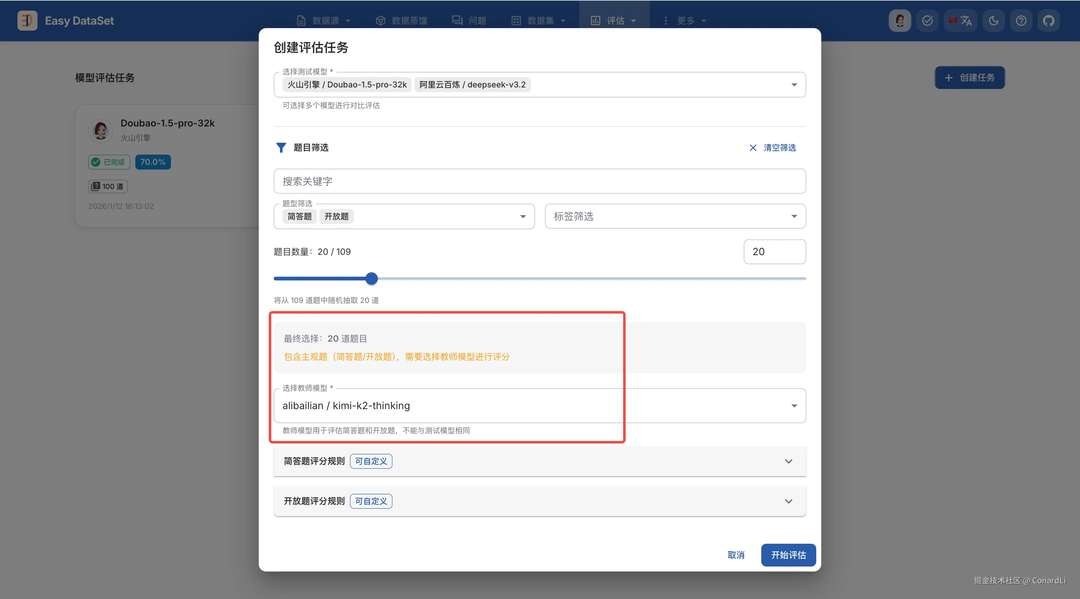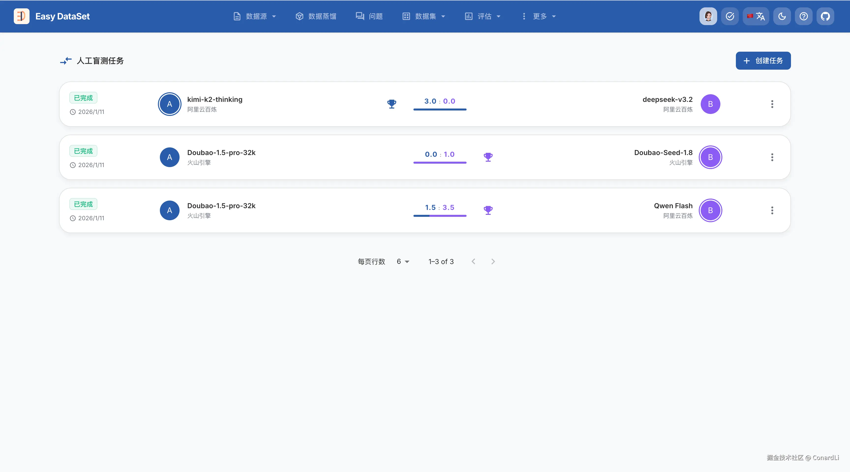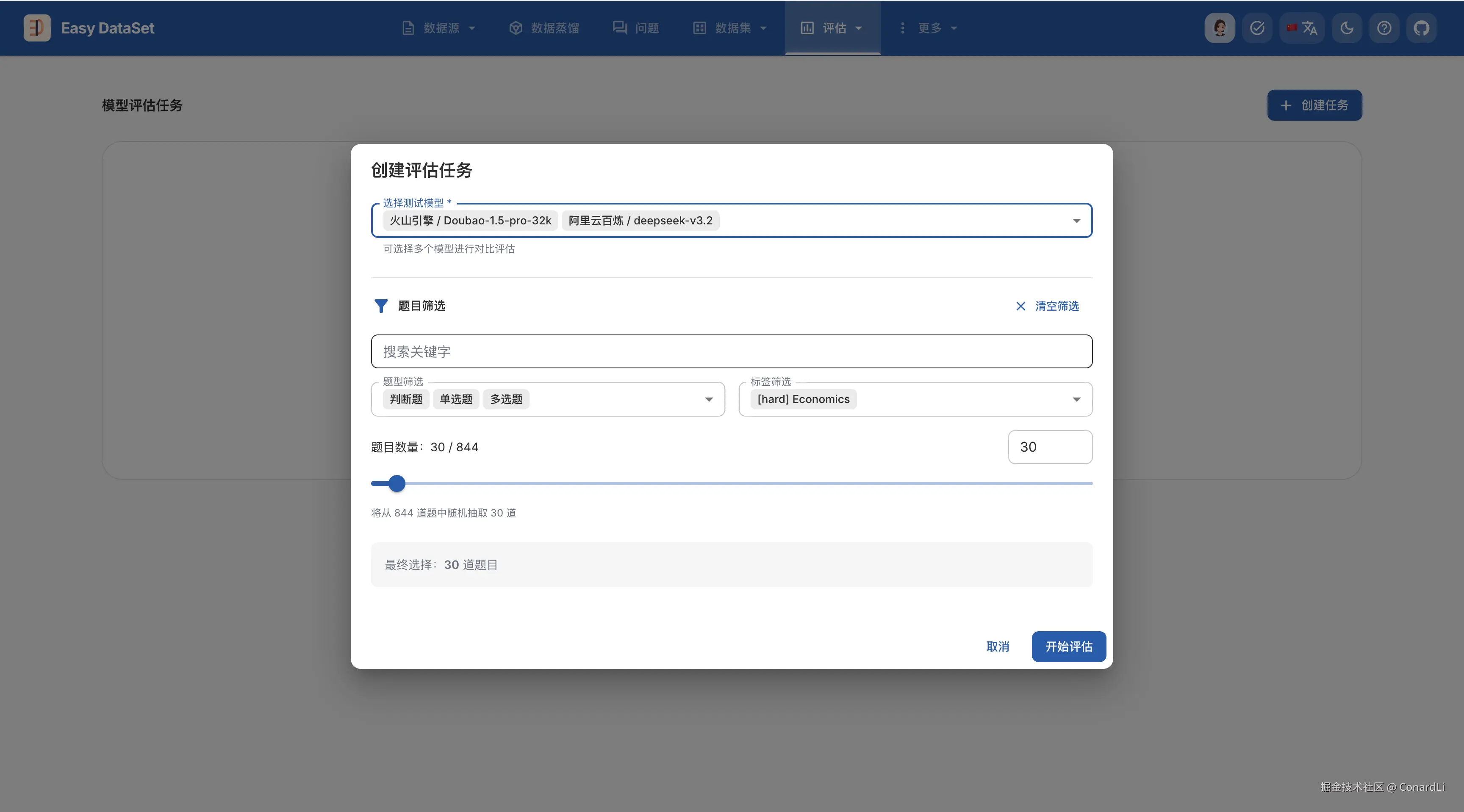 在,Easy Dataset 的 1.7.0 版本,支持了全新的 “评估” 模块,能够做到 自动化生成测试集 + 低成本的创建评估任务 + 可视化的评估结果。