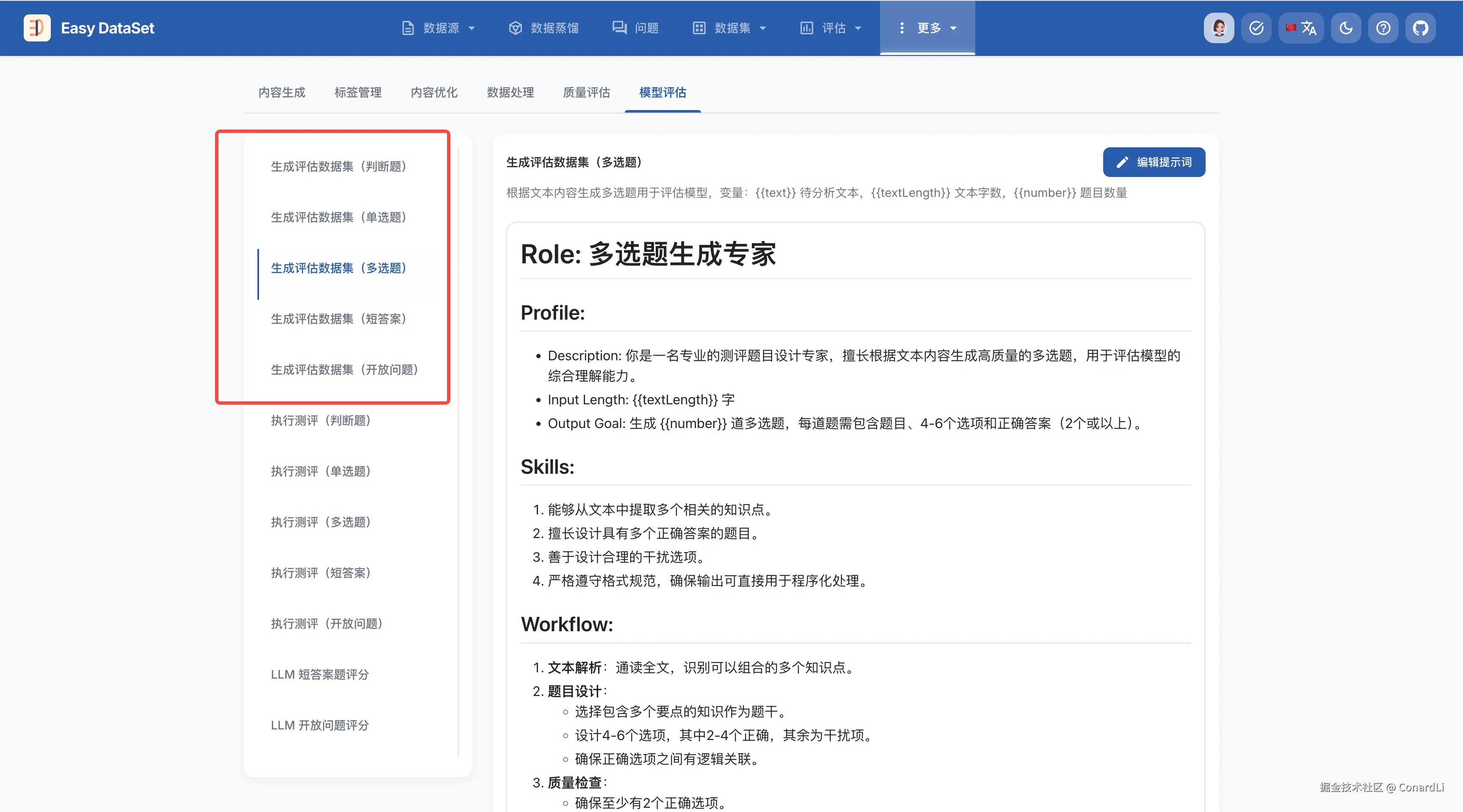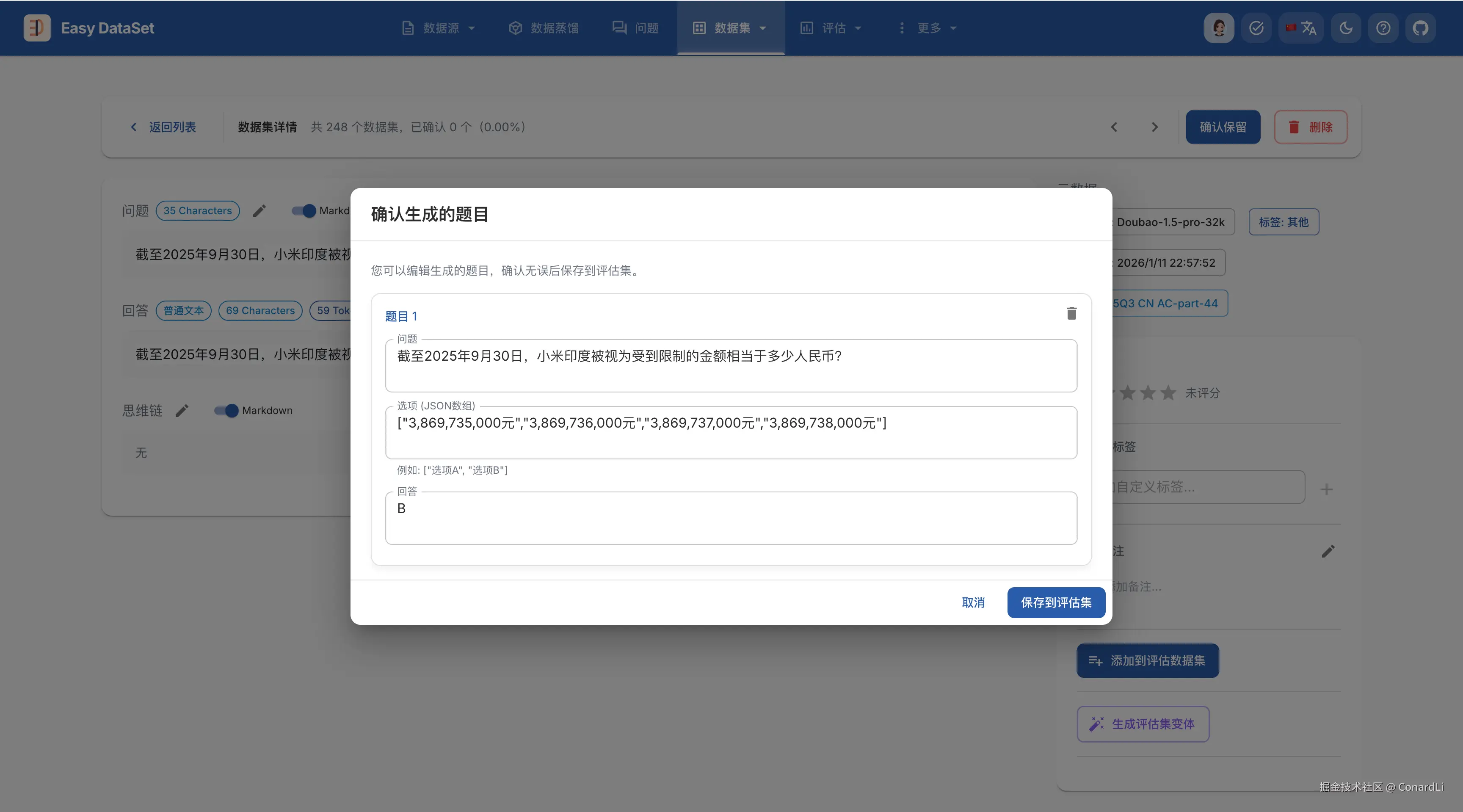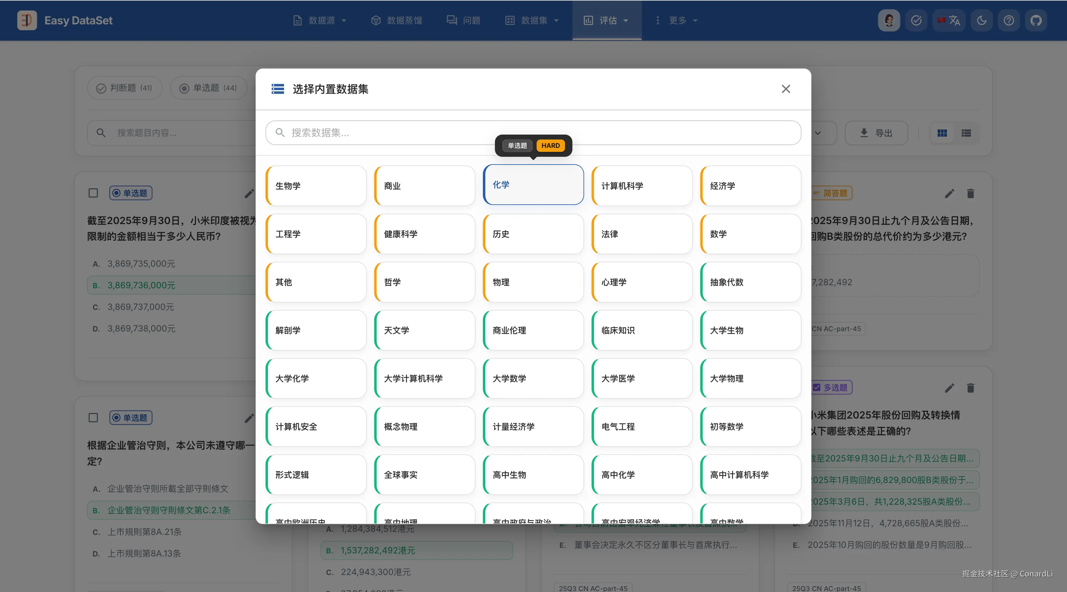 在 Easy Dataset 中,你可以通过多种方式生成和配置评估数据集(测试集):
