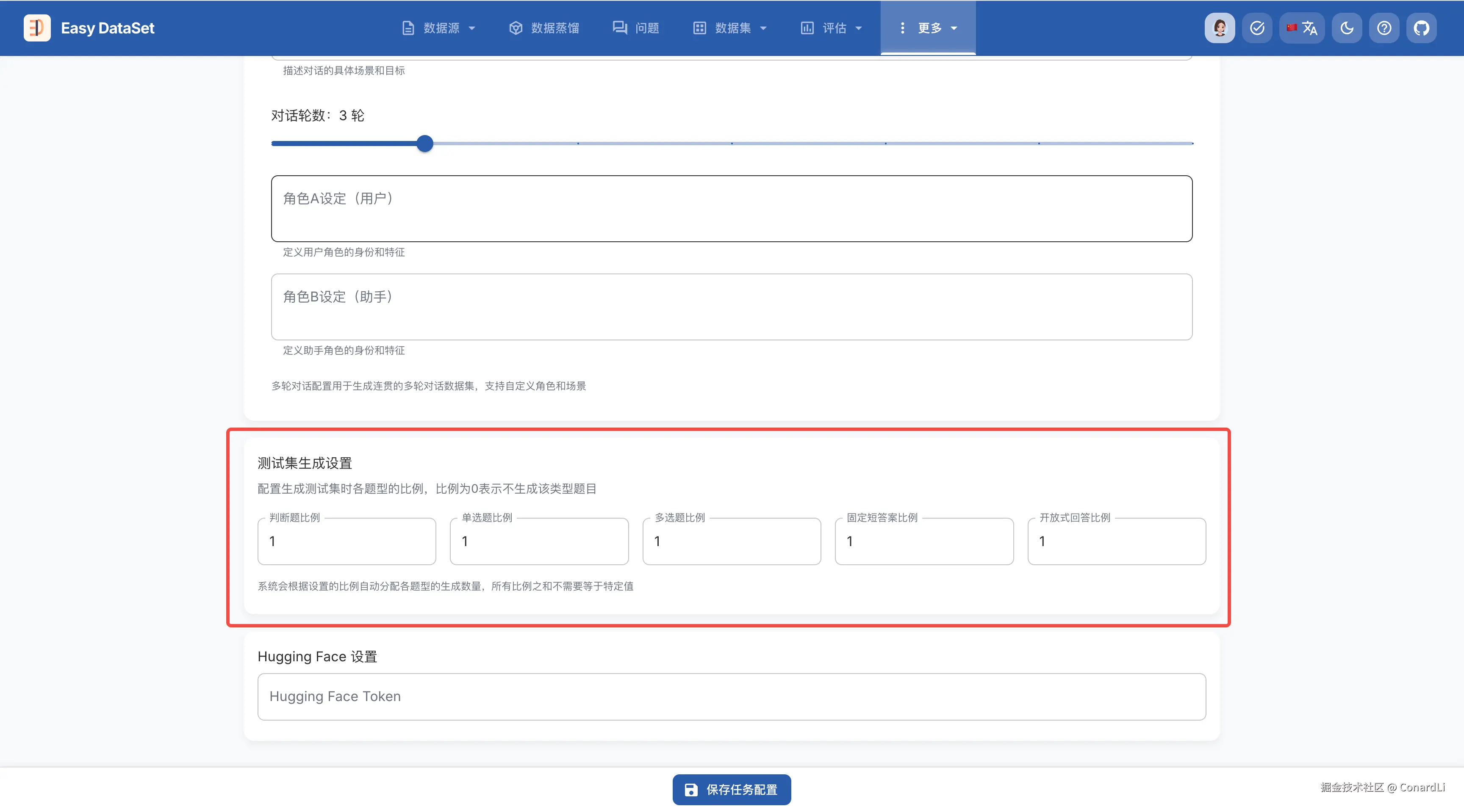 并且,在任务配置中 支持配置各题目类型生成的比例(比如:我要 30% 的判断题用于测幻觉,70% 的简答题测理解):