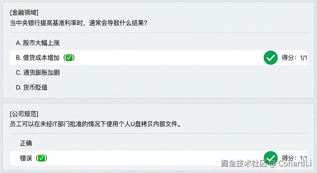 对于判断题、单选题、多选题,答案是唯一的。 系统不需要调用大模型,直接用规则代码比对。