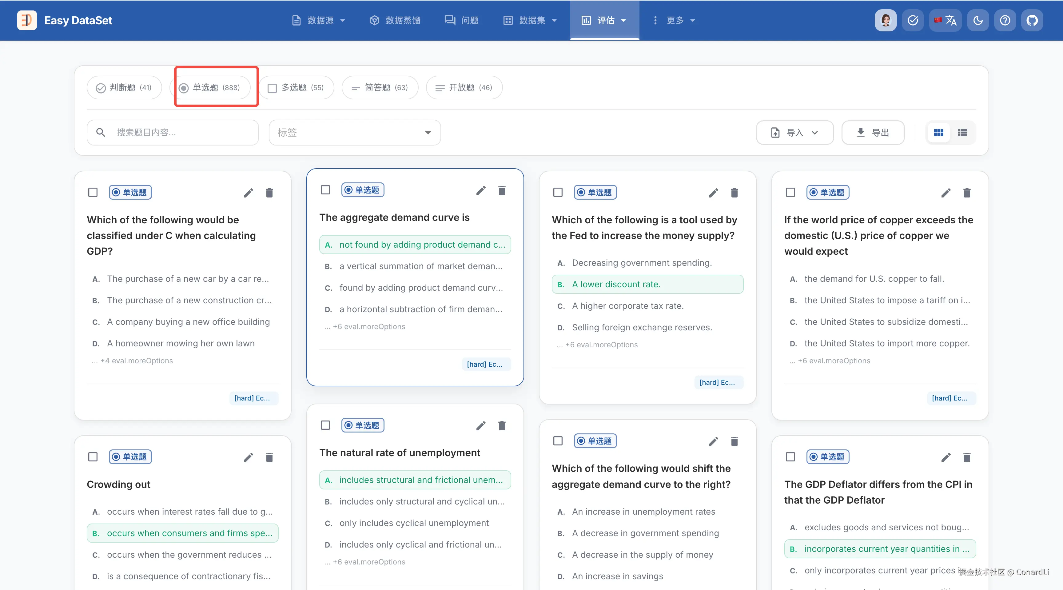 点击每个文本块上的 已生成测试题 标签,我们将跳转至【评估-评估数据集】模块,在这里你可以看到已经生成的所有数据集,你可以根据题目类型、题目内容和标签进行筛选: