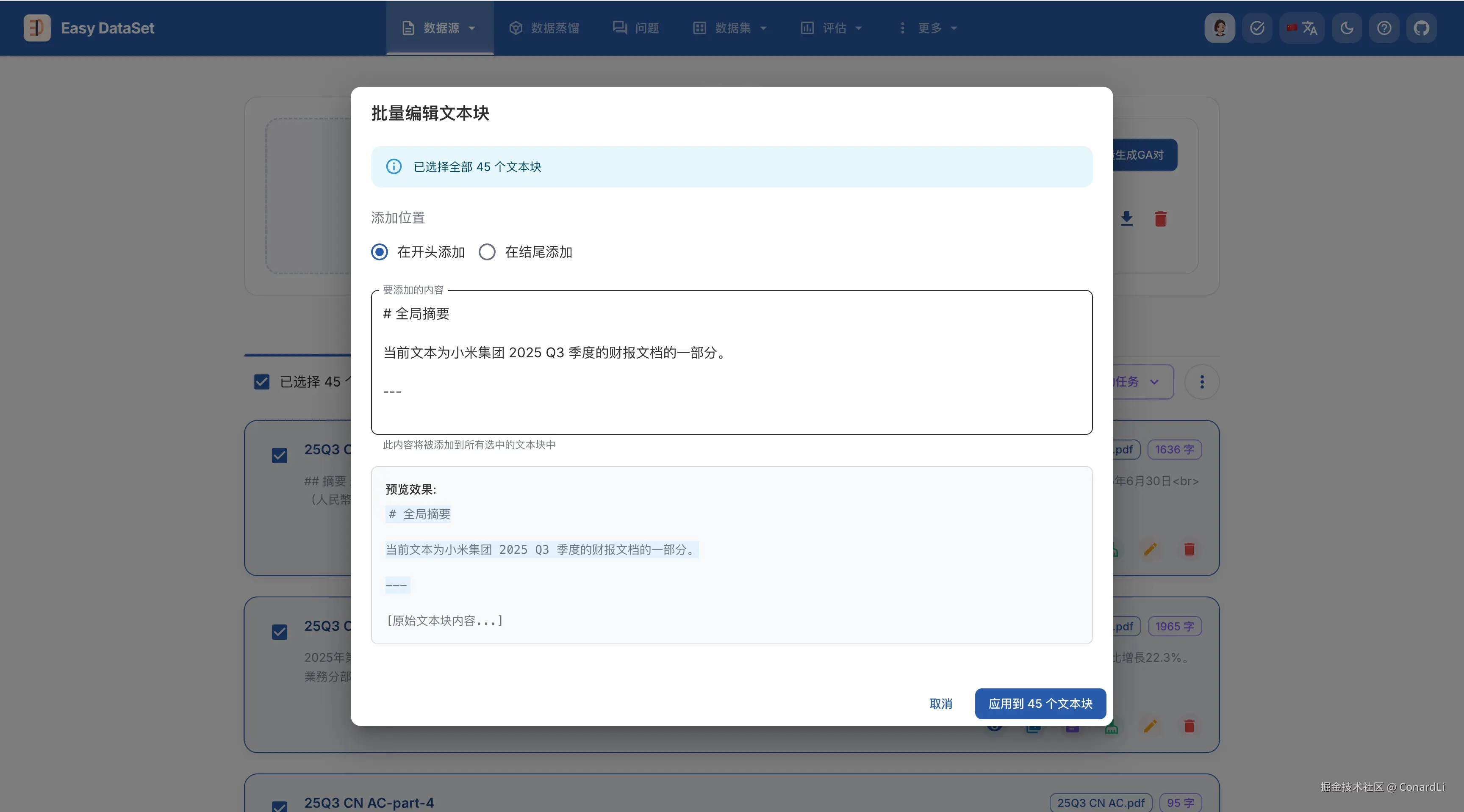 系统解析完成后,会对文档进行自动切块,为了保证后续在文本块上生成的测试集更符合主题,我们批量编辑文本块: