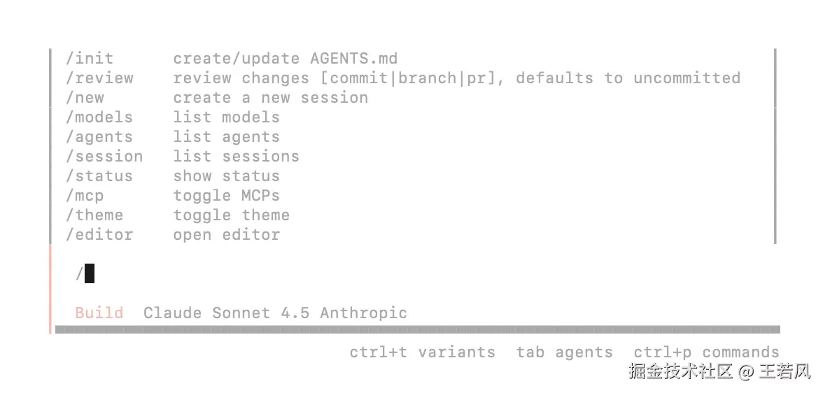 | /agents | 切换或管理AI代理(如 Plan/Build 模式) | |