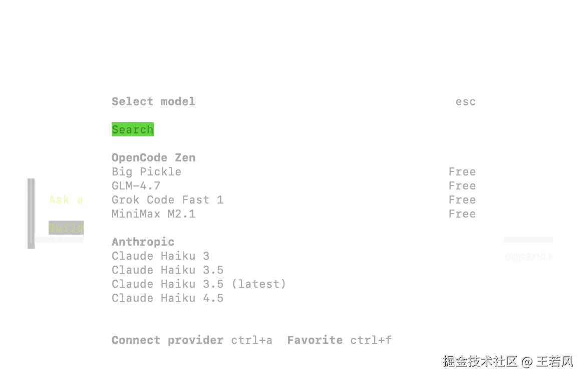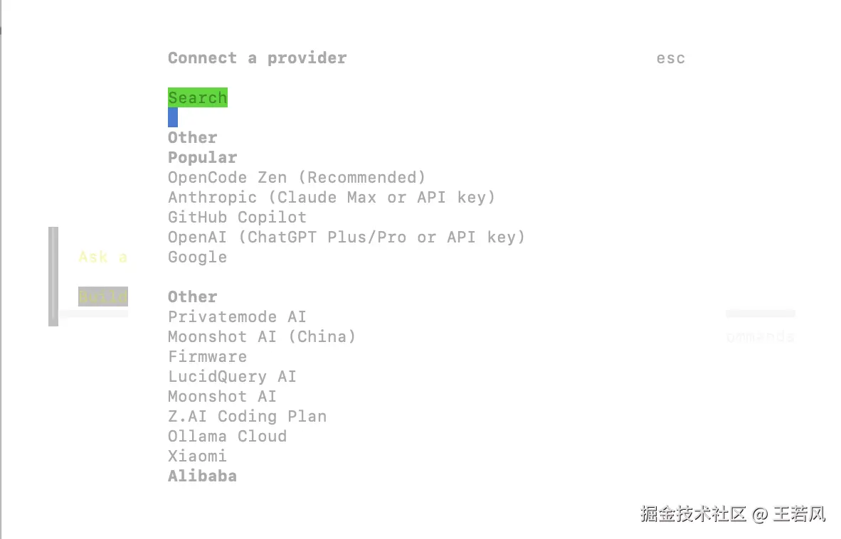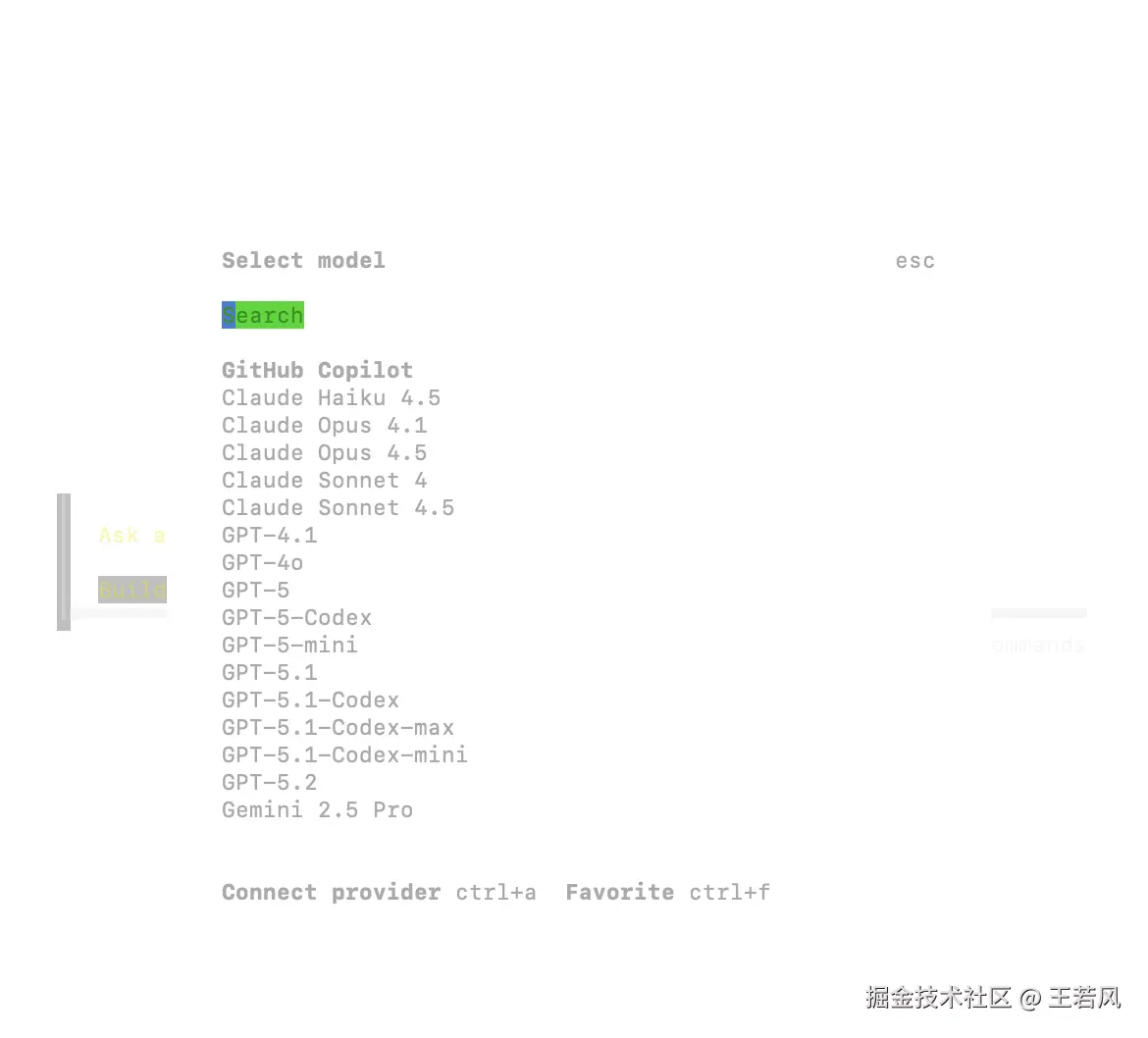 通过 /connect 命令直接添加,也可以先输入 /models 查看所有支持的模型,输入 ctrl + a 可以添加其他模型提供商