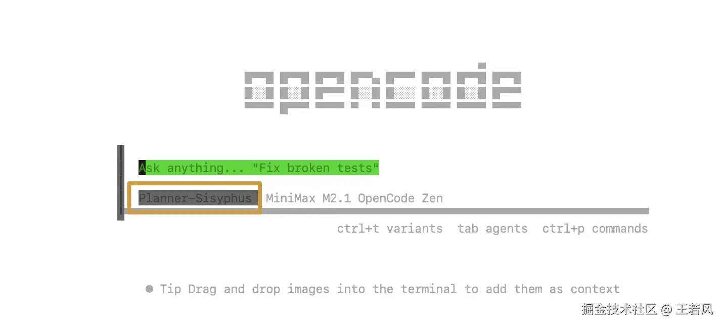 通过 opencode 命令重新打开,页面的模式指示部分的关键词变成 Sisyhus,执行模式变成 Planner-Sisyhus,代表插件加载成功