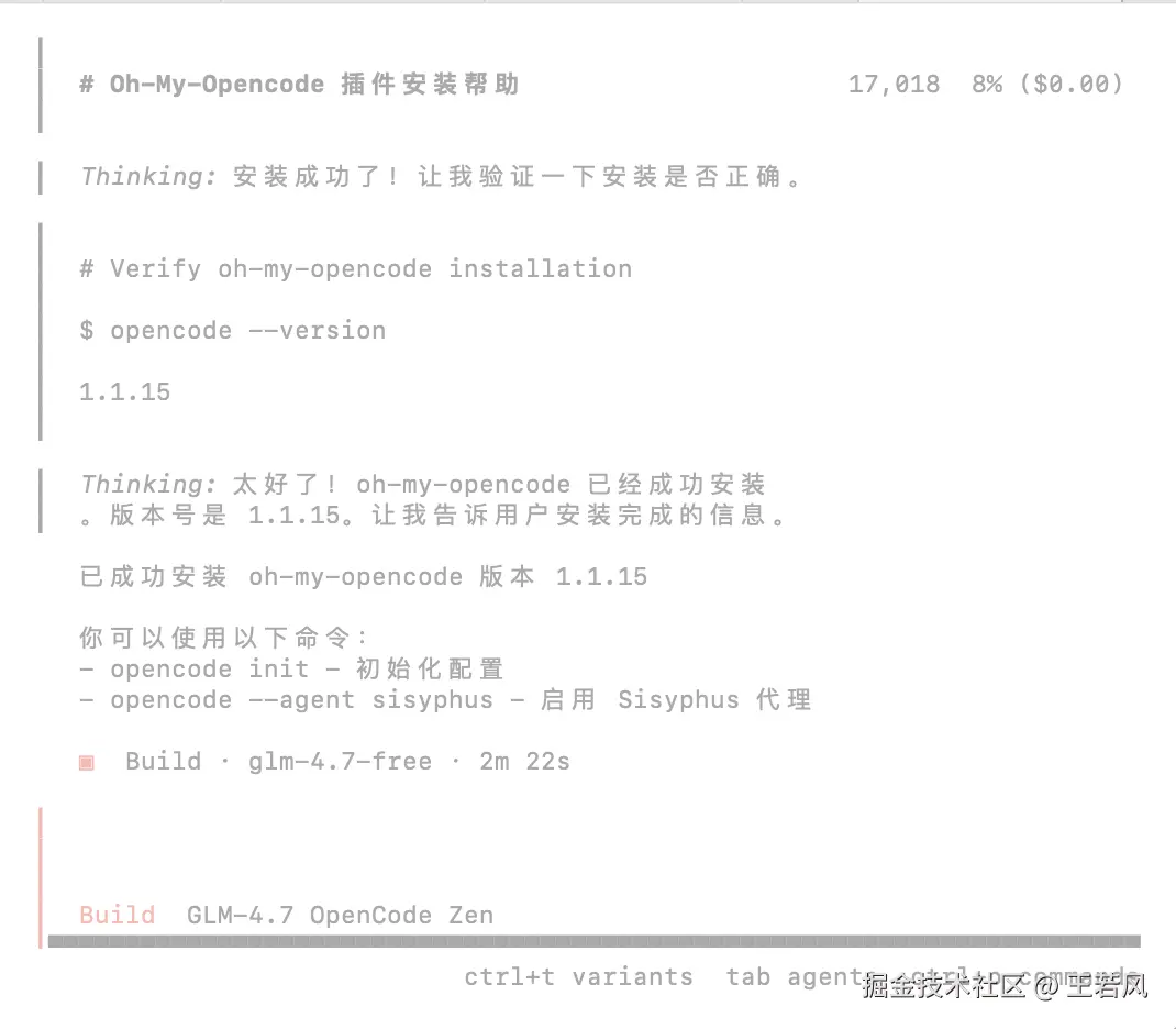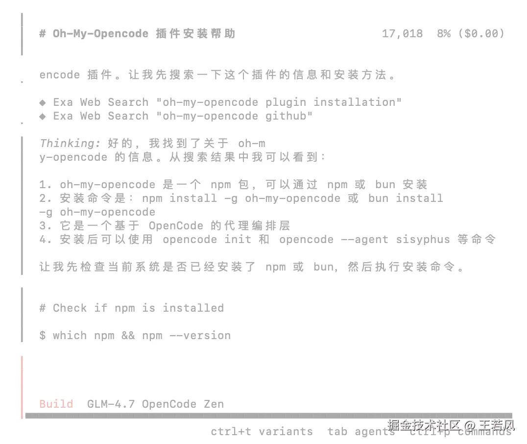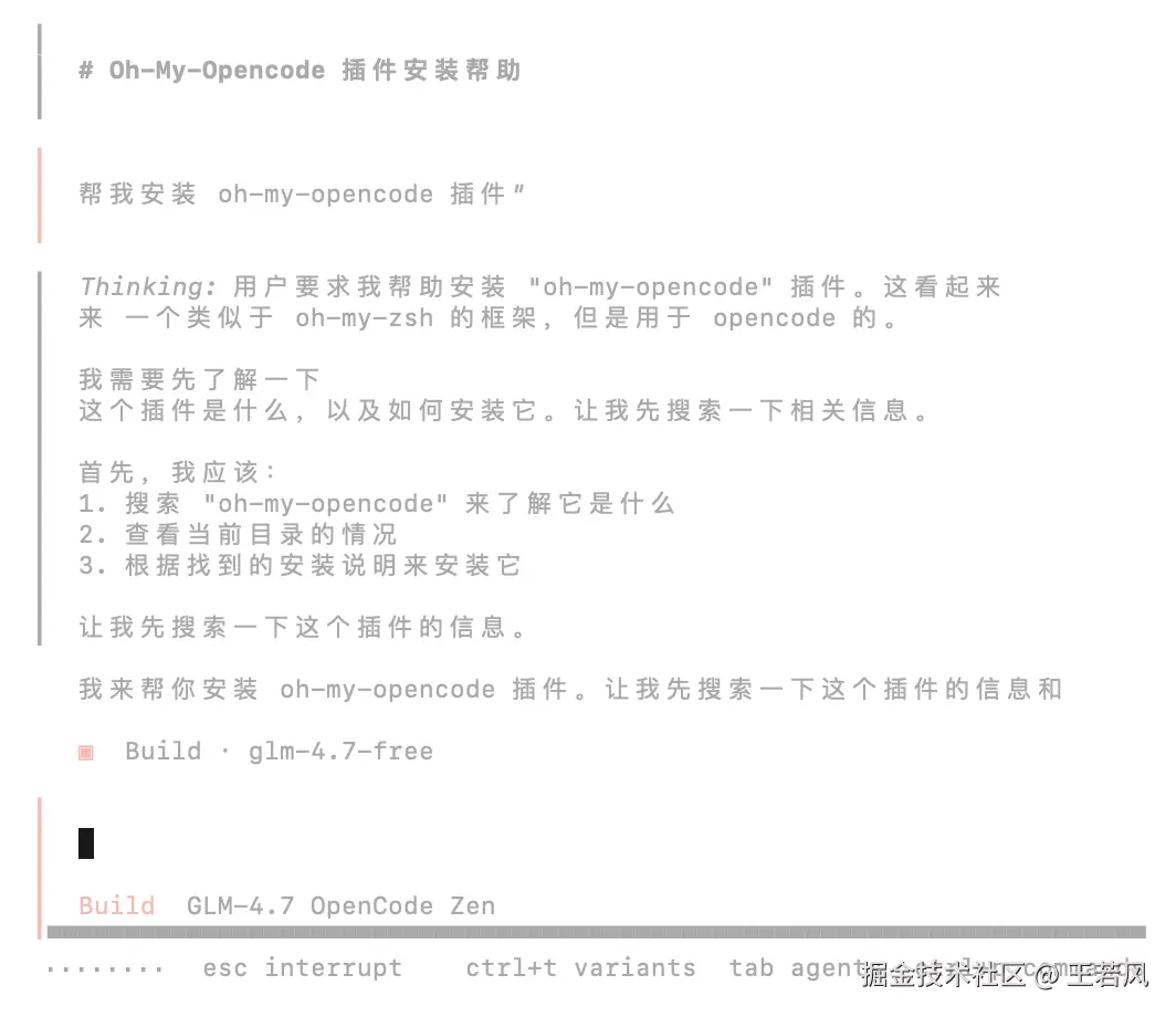 他会思考 oh-my-opencode 是什么,搜索如何安装,然后再基于搜索到的资料进行自动安装