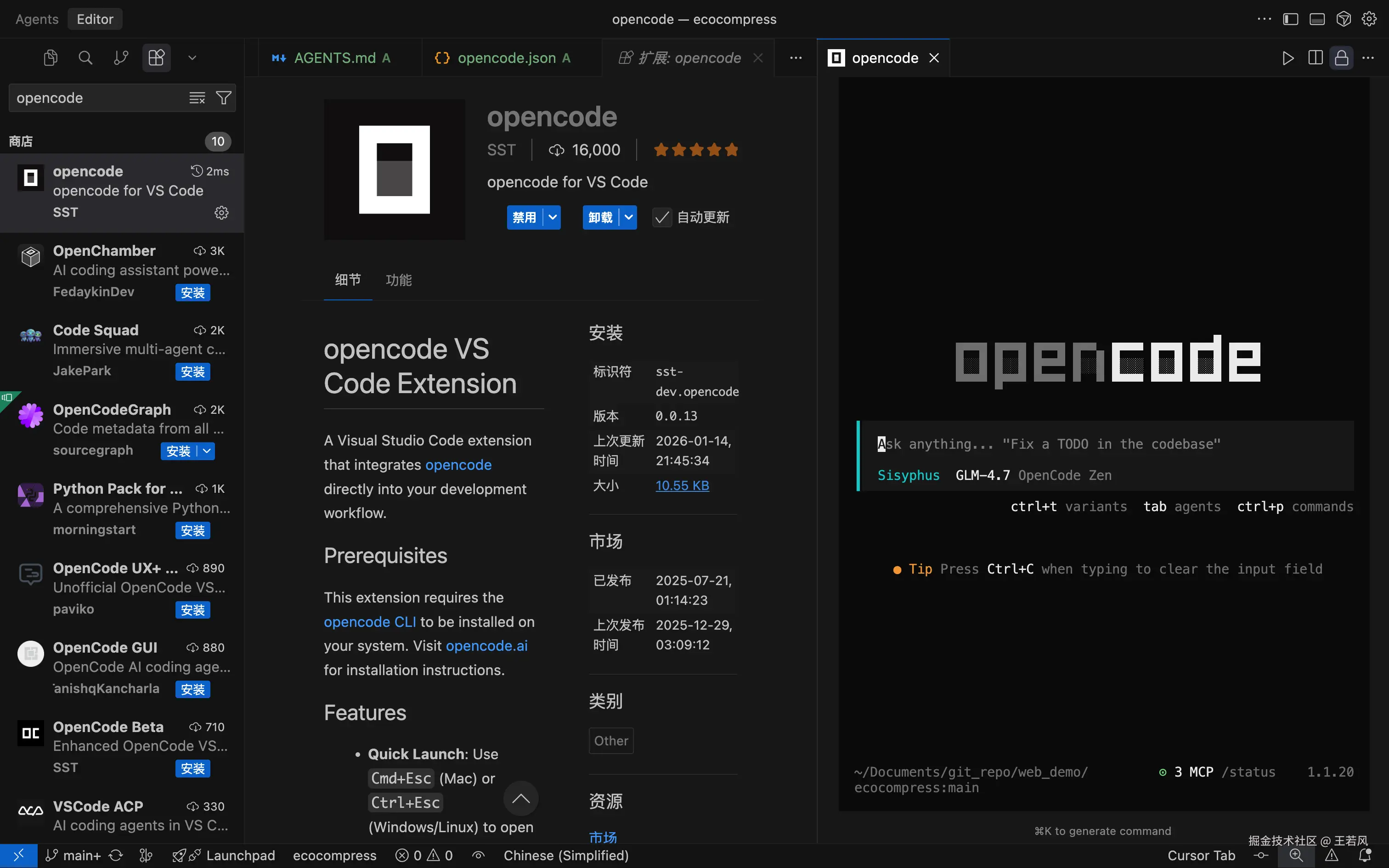 在 IDE 的应用商店搜索 opencode,安装即可