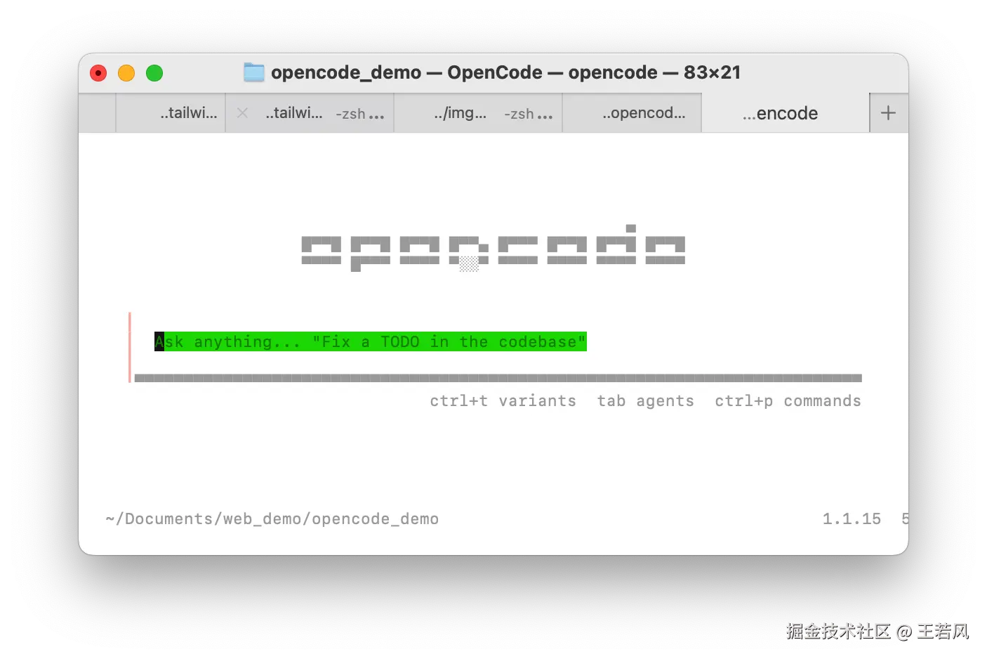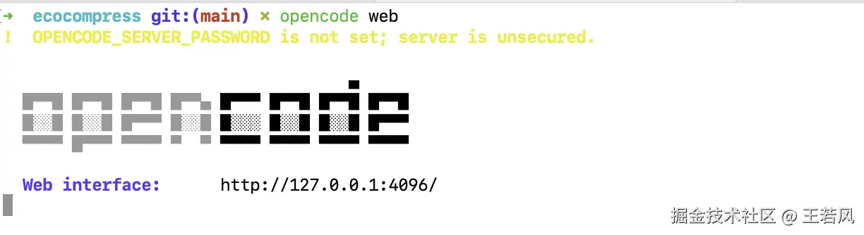 终端直接输入 opencode 命令即可,如果 opencode 命令找不到,重新开一个新的 tab 执行即可