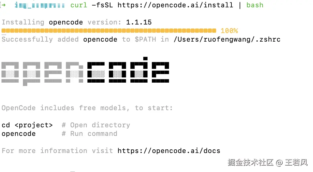 安装后可以通过opencode在终端中运行即可开始使用。