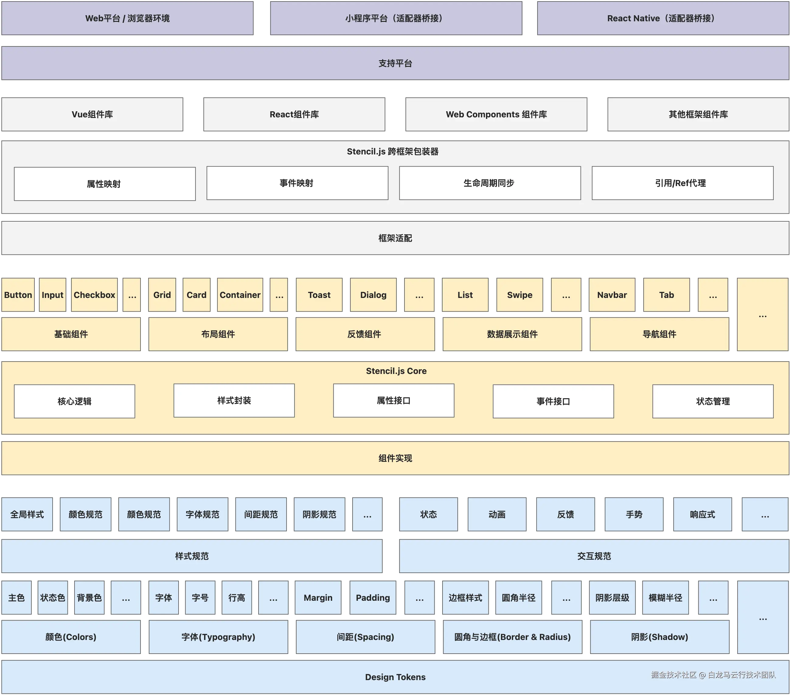 在明确目标与应用场景后,我们基于 Web Components 构建了跨框架组件库。整体过程可以沿着组件库架构图的层级顺序理解,从底层的设计规范到组件实现,再到框架适配,最后落地到各业务线支持的技术平台。