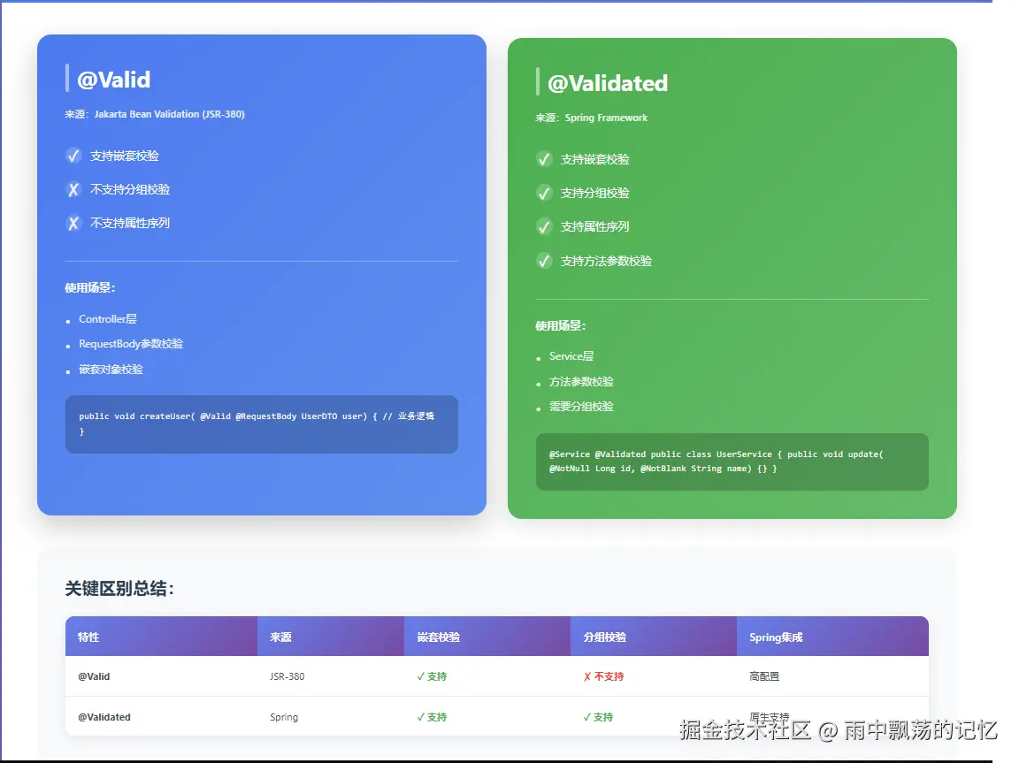 | 来源 | Jakarta Bean Validation (JSR-380) | Spring Framework |