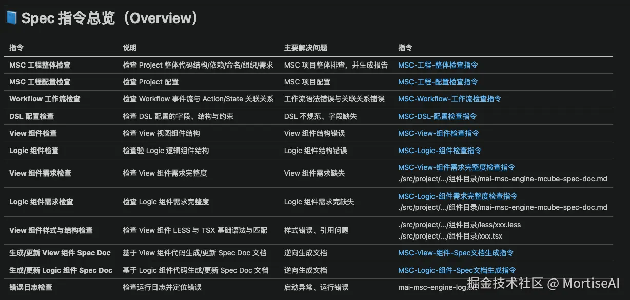 MSC Engine 的 Spec 指令体系,本质是在工程侧把这件事做成“机制”。核心不是教 AI 怎么写,而是构建一套 可执行、可回归、可审计 的交付链路,让每一次产出都能验证、每一次修改都能追溯。